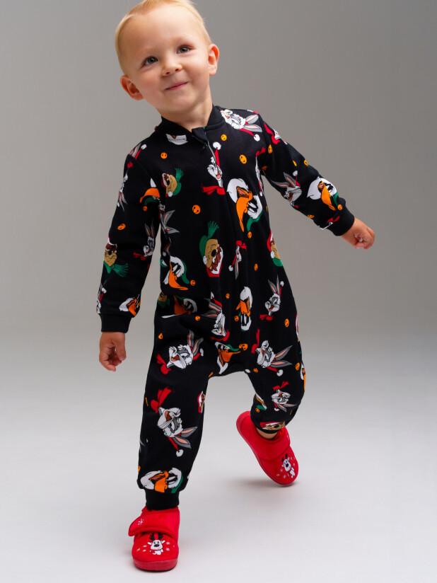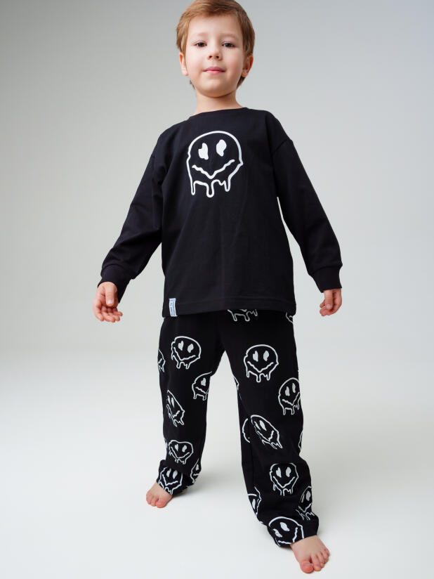 Черный детский трикотажный комплект для мальчика от PlayToday — стильный и удобный костюм, состоящий из лонгслива с длинным рукавом и брюк на резинке. Модель разработана специально для детей от 3 до 7... Показать описание лет и станет отличным решением как для дома, так и для похода в детский сад. Особенности модели: + мягкий и эластичный трикотаж — приятен к телу, не раздражает кожу и позволяет коже дышать + лонгслив с длинным рукавом — универсальная замена футболке в прохладное время года + брюки на комфортной резинке — легко надевать и удобно носить, хорошо держатся на талии + светящийся в темноте принт на футболке и брюках — эффектный дизайн, который понравится детям и сделает образ ярким и необычным + отсутствие карманов — ничего не мешает во время сна, игр и занятий в детском саду + свободный крой — не сковывает движений, подходит для активных игр и прогулок Совет по стилю: Комплект можно носить как самостоятельный образ или сочетать с худи, жилеткой или ветровкой PlayToday. Брюки легко комбинируются и с другими футболками или лонгсливами, создавая разные варианты для повседневного гардероба. Размеры: модель представлена на рост 98, 104, 110, 116 и 122 см — подходит для мальчиков от 3 до 7 лет. Модный детский трикотажный костюм для мальчика с лонгсливом и брюками на резинке от PlayToday — идеальный выбор для детского сада, дома и активных прогулок.