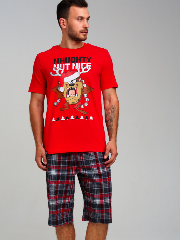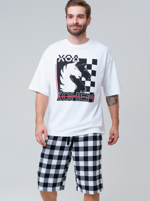 Пижама: футболка, шорты. Трикотажная футболка силуэта oversize. Высокое содержание хлопка 95%. Благодаря наличию эластана в составе ткани, изделие проще в уходе и держит форму. Фланелевые шорты класси... Показать описаниеческого прямого кроя с карманами. Эластичный пояс с тесьмой позволяет легко надевать брюки и утягивать до комфортной посадки.