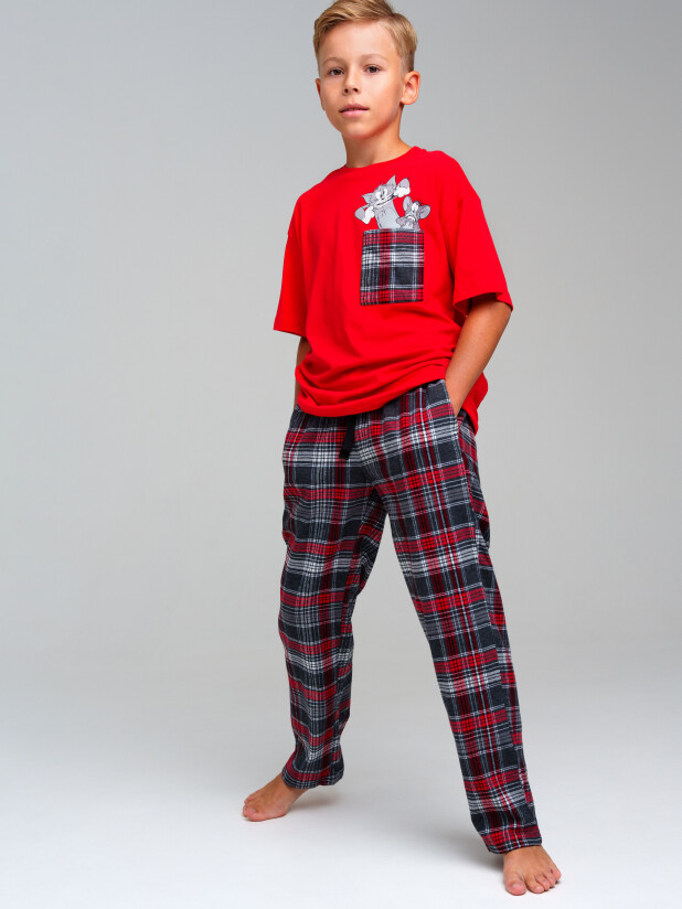 Пижама для мальчика подростка. Футболка из качественного и приятного на ощупь трикотажа джерси с высоким содержанием хлопка 95%. Благодаря наличию эластана в составе ткани изделие проще в уходе и держ... Показать описаниеит форму. Брюки - 100% хлопок. Фланель - мягкая, приятная к телу ткань с небольшим начесом. Эластичный пояс с тесьмой позволяет легко надевать брюки и утягивать до комфортной посадки.