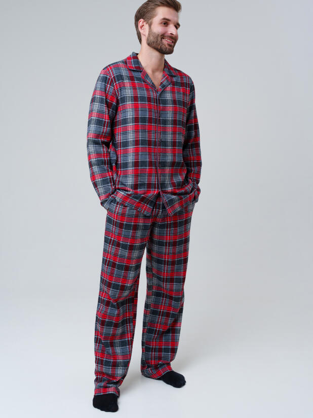 Мужская фланелевая пижама. 100% хлопок. Фланель - мягкая, приятная к телу ткань с небольшим начесом. Застежка на пуговицы. Карманы в брюках. Эластичный пояс с тесьмой позволяет легко надевать брюки и ... Показать описаниеутягивать до комфортной посадки. Можно составить family look c детским вариантом пижамы аналогичного дизайна.