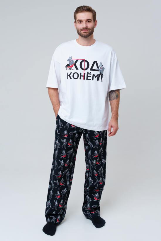 Пижама: футболка, брюки. Трикотажная футболка силуэта oversize. Высокое содержание хлопка 95%. Благодаря наличию эластана в составе ткани, изделие проще в уходе и держит форму. Фланелевые брюки класси... Показать описаниеческого прямого кроя с карманами. Эластичный пояс с тесьмой позволяет легко надевать брюки и утягивать до комфортной посадки.