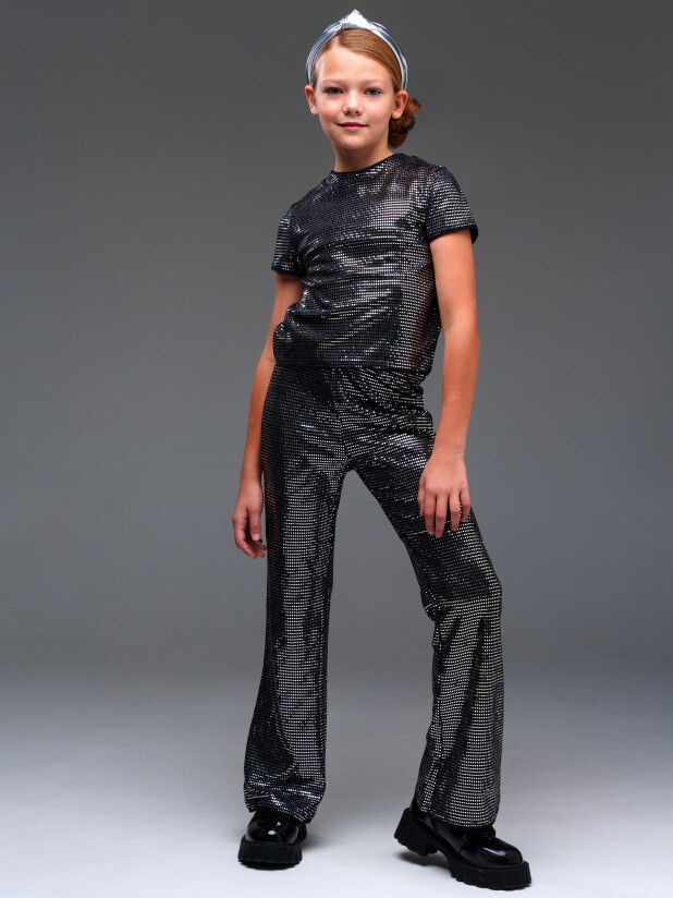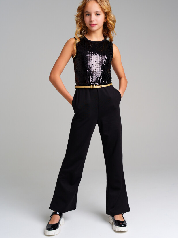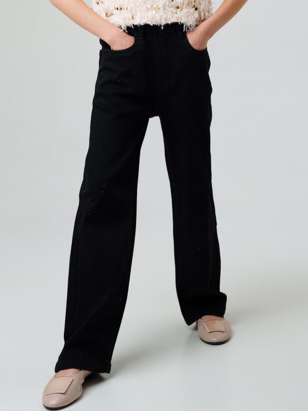 Джинсы прямые черные со стразами для девочки подростка от PlayToday — тёплая, стильная и комфортная модель, которая станет идеальным выбором для холодного времени года. Преимущества модели: + застежка... Показать описание на молнию и болт — удобно регулировать посадку + декор из черных страз — сделает ваш образ стильным и ярким + свободный крой с высокой посадкой — максимально комфортно и удобно + пять функциональных карманов + комфортная посадка за счет внутренней утяжки Джинсы выполнены из черного денима средней плотности. Модель отлично держит тепло, остаётся комфортной и приятной к телу даже в прохладную погоду. Прочный материал устойчив к износу и долго сохраняет опрятный внешний вид. Джинсы не сползают и не сковывают движений — идеально для активных девочек. Удобные карманы позволяют брать с собой необходимые мелочи. Эти джинсы отлично сочетаются с худи, свитшотами, футболками и зимней верхней одеждой. Идеальны для школы, прогулок и повседневных активностей. Материал сохраняет форму и цвет даже после многократных стирок. Подходят для девочек от 8 лет.