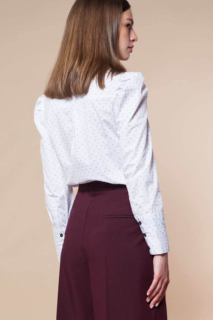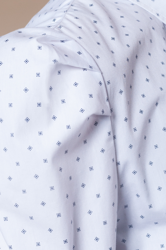Блузка из хлопка с мелким рисунком и актуальными защипами по окату рукава.Вопросы по товару