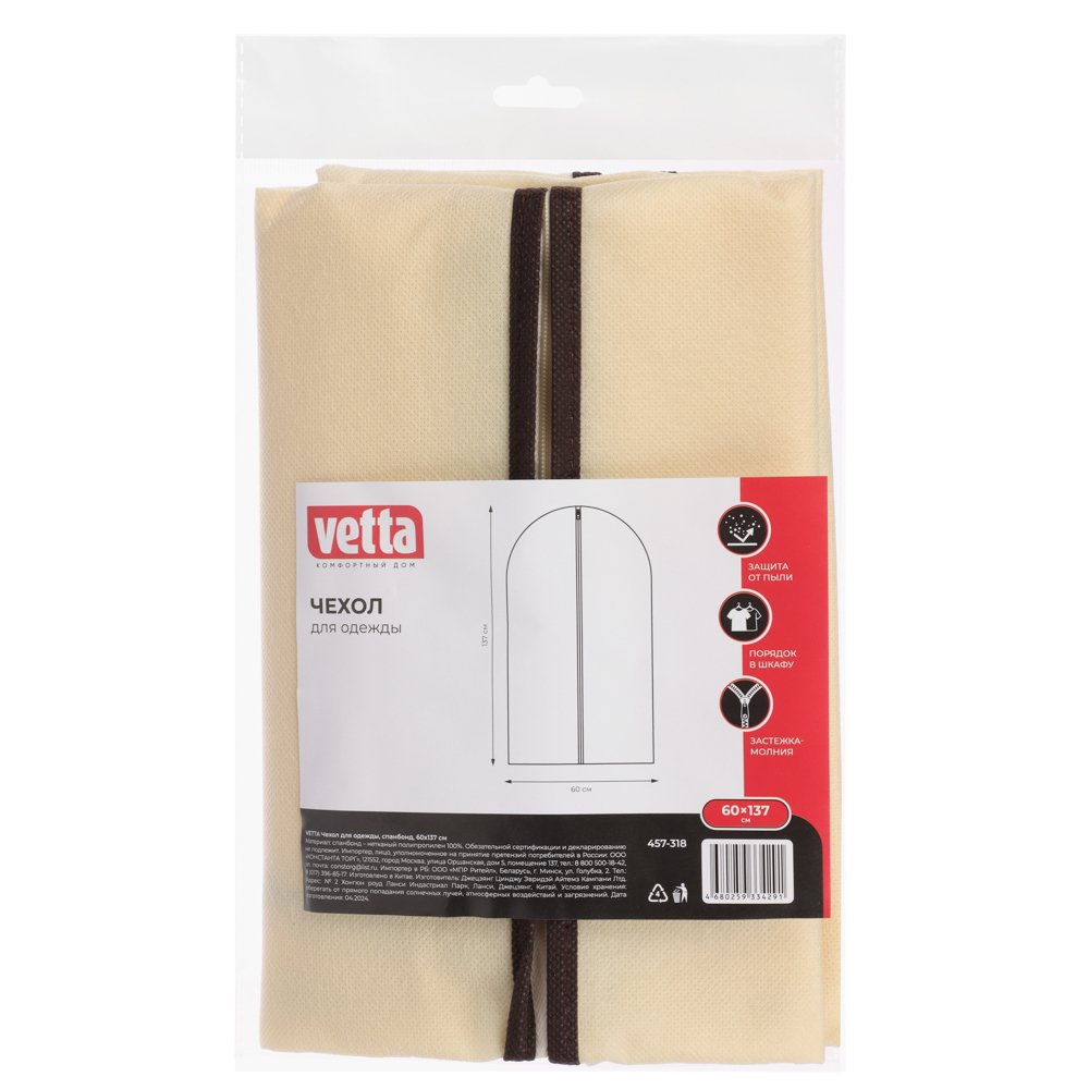 Чехол для одежды Vetta 60х137 см защитит ваши наряды при транспортировке и обеспечит надежное хранение сезонных вещей. Материал чехла спанбонд - это разновидность нетканого полотна, которое "дышит" и ... Показать описаниепозволяет воздуху свободно проникать внутрь, не пропуская пыль. Повесьте одежду на плечики, разместите внутри чехла, застегните молнию и расположите на штанге в гардеробе.