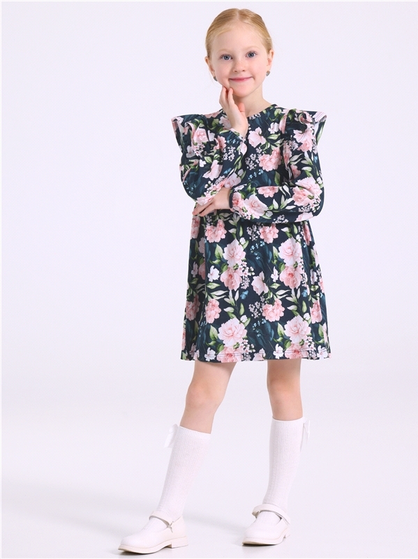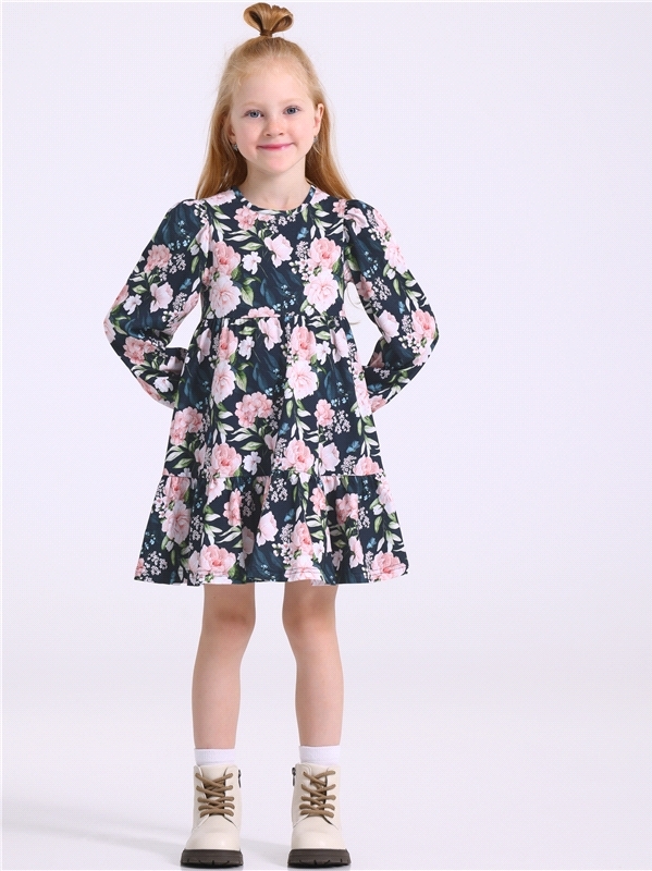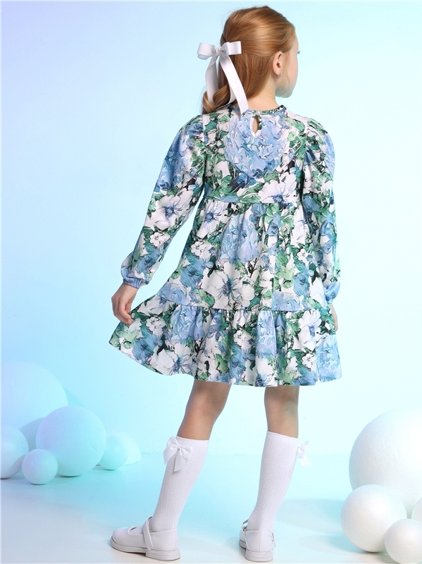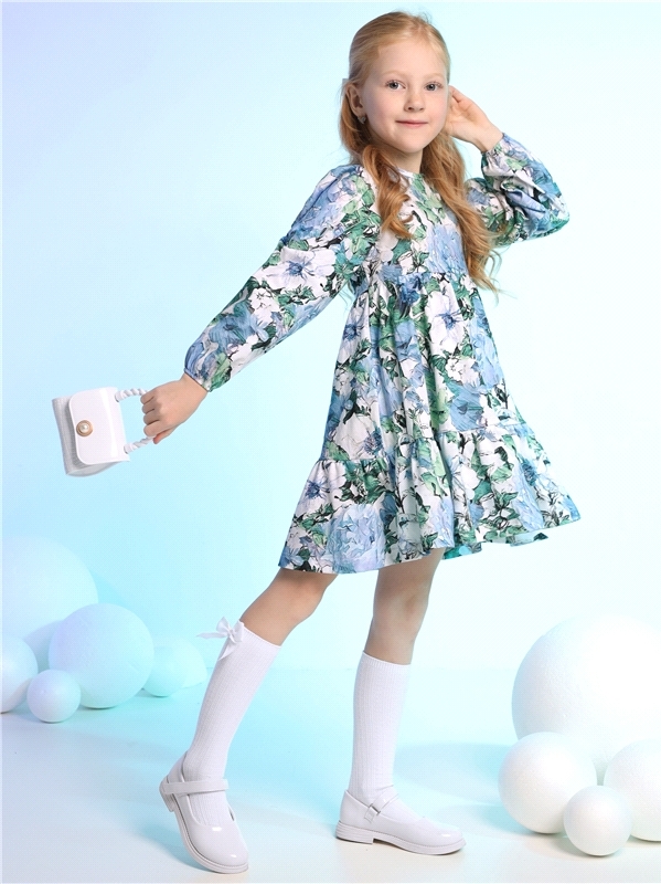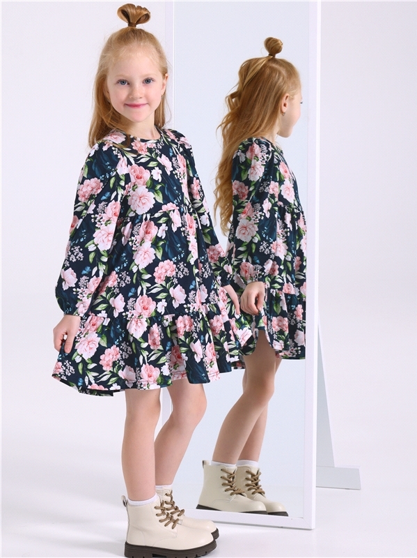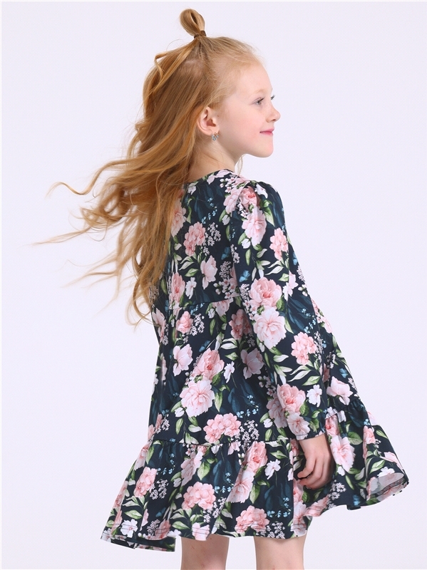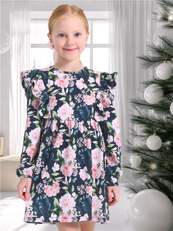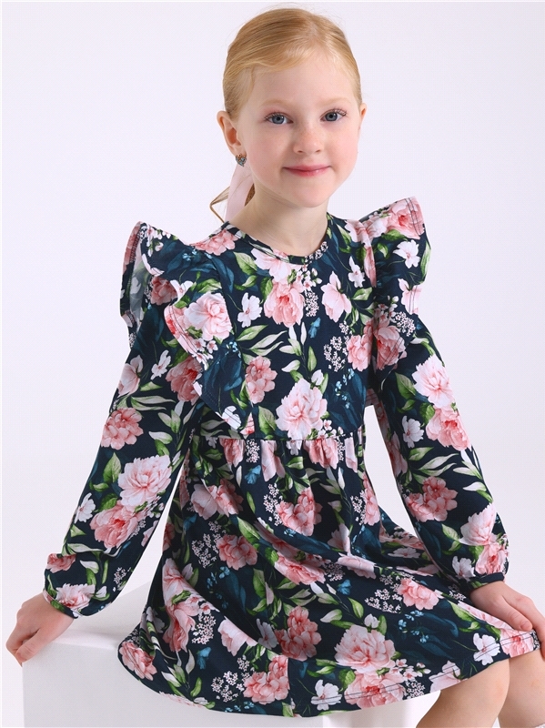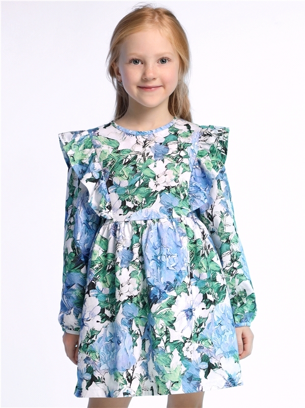 Платье для девочки выполнено из кулира - легкого хлопкового полотна:с набивным принтом. Изделие с длинными рукавами и с присборенной по талии юбочкой:на полочке и спинке воздушные оборки:застежка на п... Показать описаниеуговицу по спинке. Уход: только машинная стирка (руками не стирать!) при температуре 40 градусов:без предварительного замачивания. Состав: кулир / хлопок 100%.