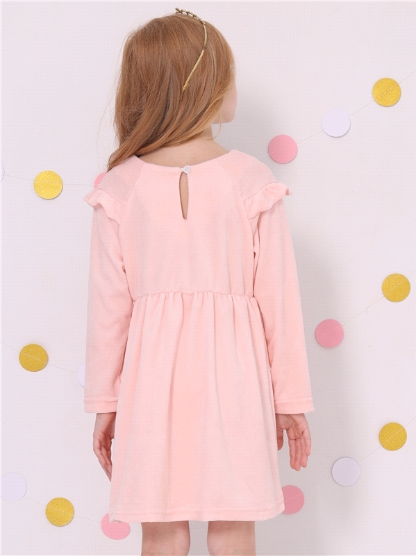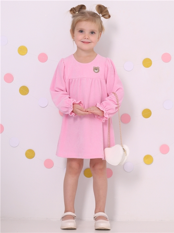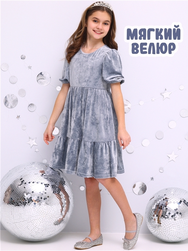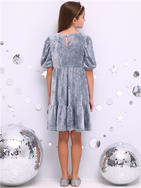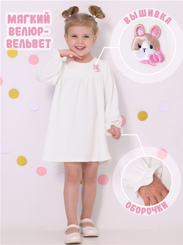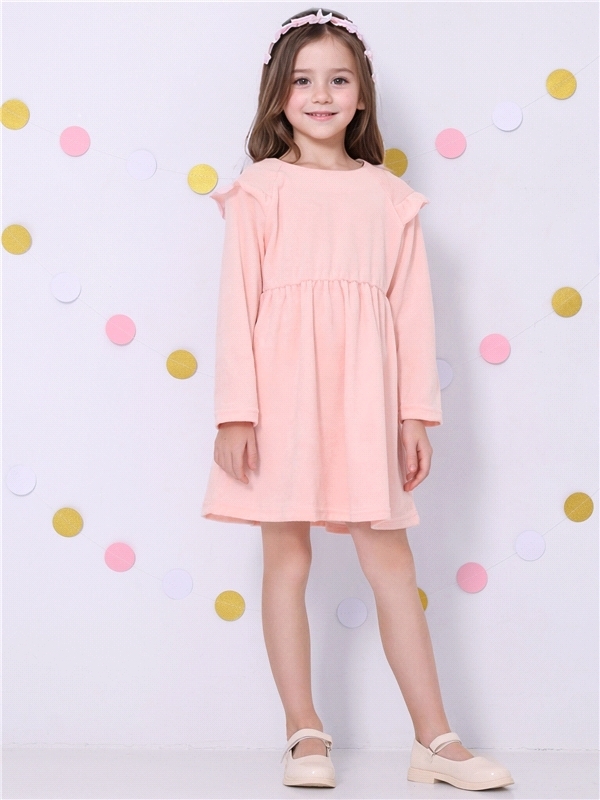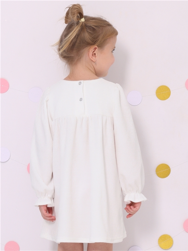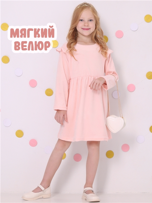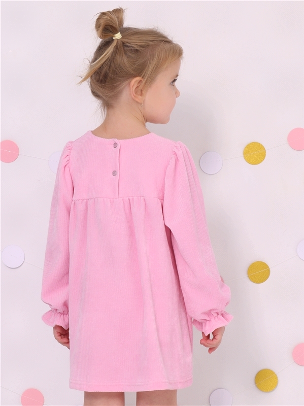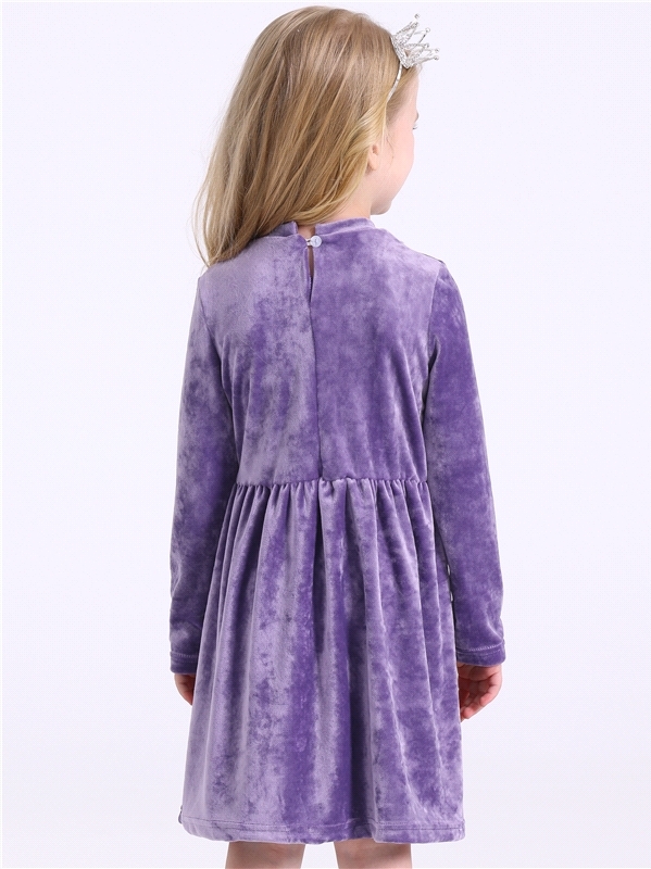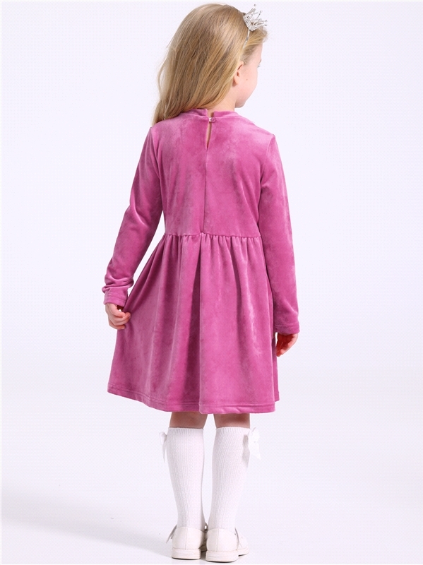 Платье для девочки из мягкого велюрового полотна. Изделие трапециевидного силуэта с длинными рукавами:собранными по низу на эластичную тесьму и спущенной линией плеча. По спинке - застежка на пуговицу... Показать описание. Уход: деликатная машинная стирка (руками не стирать!) при температуре 40 градусов:без предварительного замачивания. Состав: велюр / ПЭ 97% + лайкра 3%.