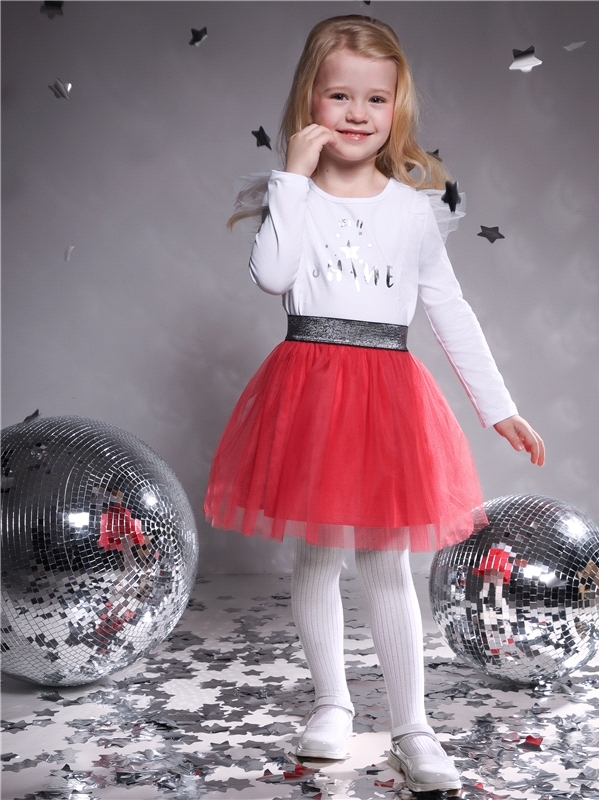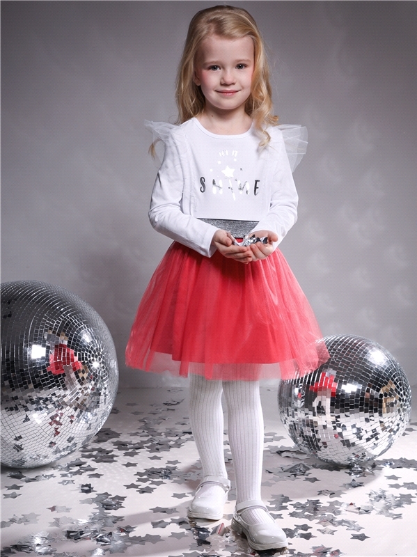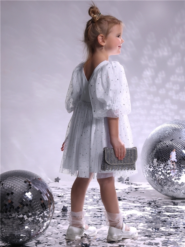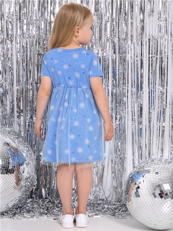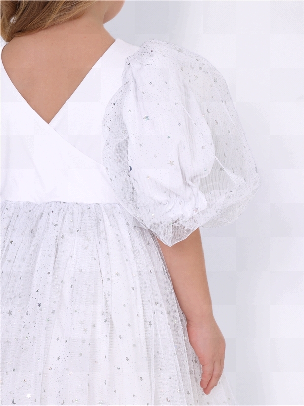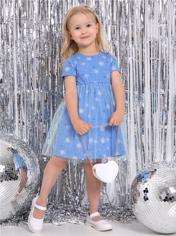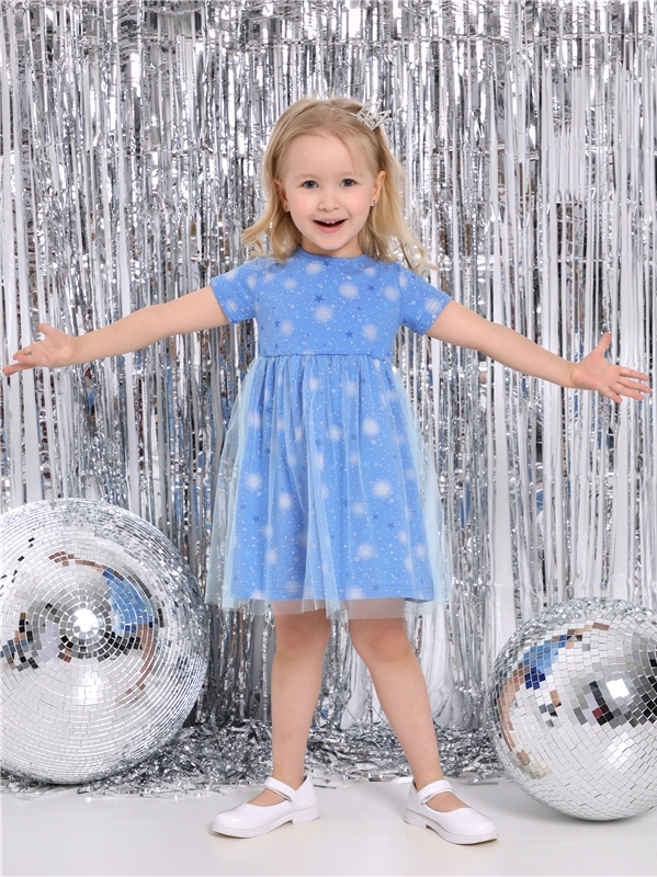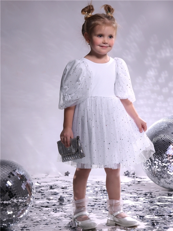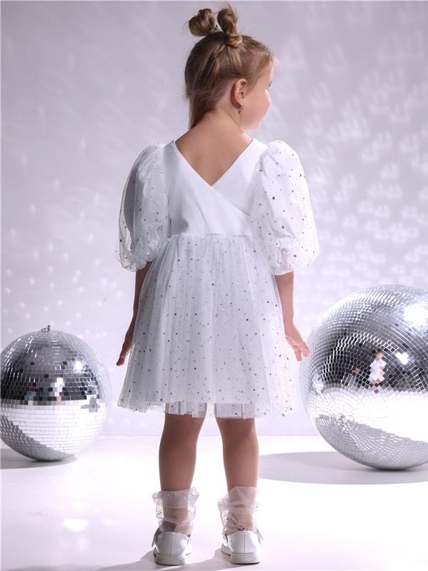 Нарядное платье для девочек из тонкого хлопкового полотна с лайкрой. Изделие отрезное по линии талии:с объемными двойными рукавами-фонариками и пышной юбочкой из сетки. Спинка с V-образным вырезом:вып... Показать описаниеолнена на запАх. Сеточка украшена серебристыми звездочками. Уход: только деликатная стирка при температуре 40 градусов:без предварительного замачивания. Состав: кулир с лайкрой / хлопок 90% + лайкра 8% + пэ 2%.