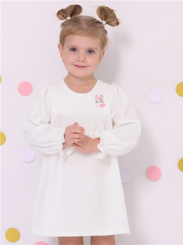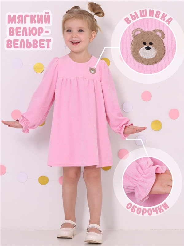 Нарядное платье для девочки из мягкого вельвета в крупный рубчик. Изделие трапециевидного силуэта с отрезной кокеткой на подкладке из тонкого кулира:длинные рукава-фонарики по низу собраны на резинку:... Показать описаниеобразуя оборку. Юбочка присборена по линии кокетки:полочка украшена небольшой вышивкой. По спинке застежка на кнопки. Отличный выбор для праздника для маленьких принцесс! Уход: только машинная стирка (руками не стирать!) при температуре 40 градусов:без предварительного замачивания. Изделия с печатью и декором перед стиркой необходимо вывернуть на изнаночную сторону. Состав: велюр-вельвет / хлопок 78% + ПЭ 22%.