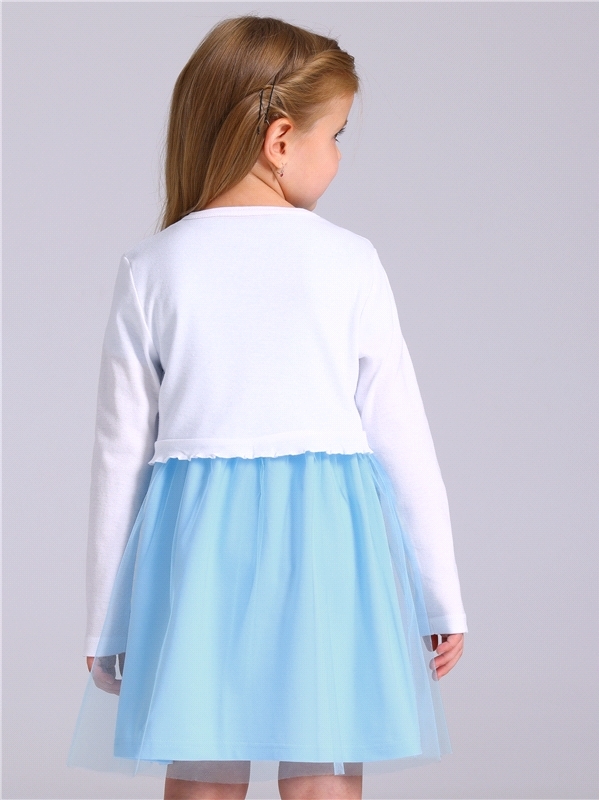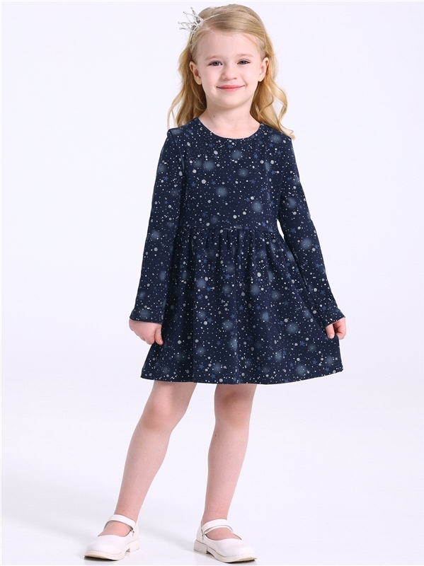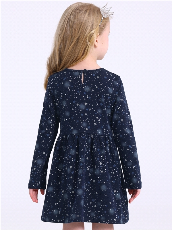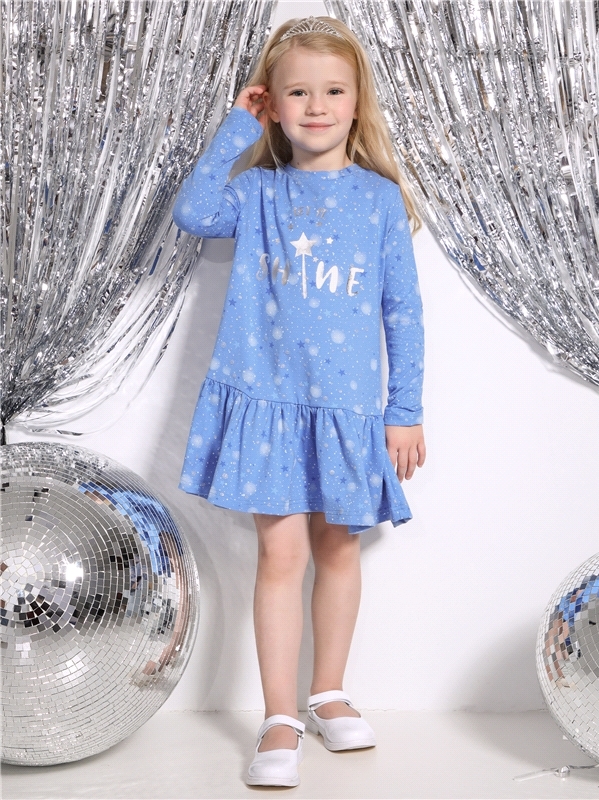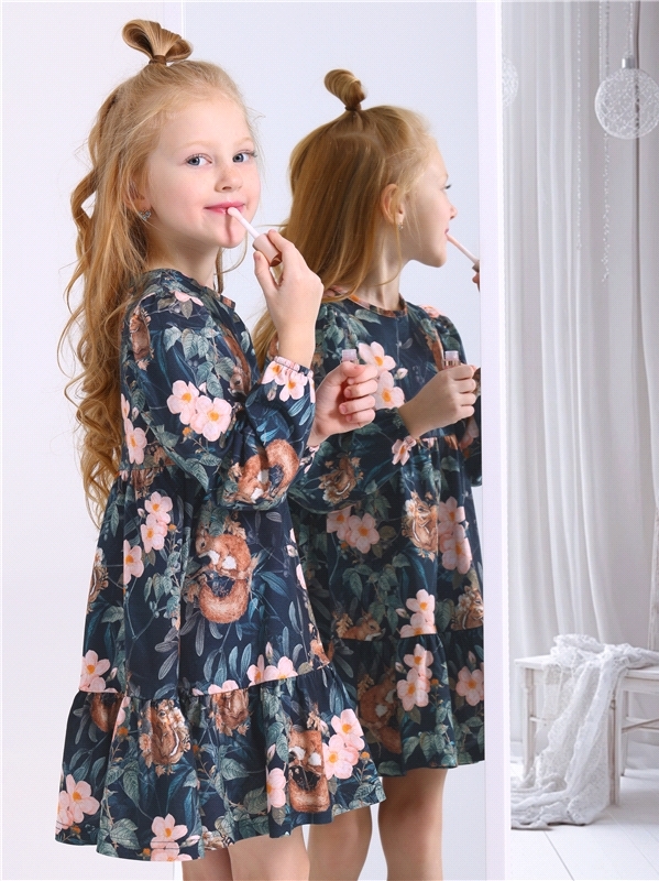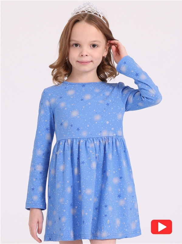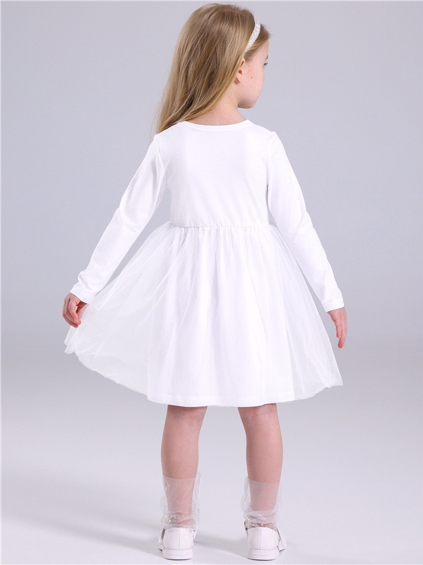Платье для девочки выполнено из кулира – лёгкого хлопкового полотна с лайкрой. Изделие с длинными рукавами и с присборенной по талии юбочкой:застежка на пуговицу по спинке:украшено печатью на глитерно... Показать описанием полотне. Уход: деликатная стирка при температуре 40 градусов:без предварительного замачивания. Изделия с печатью и декором перед стиркой необходимо вывернуть на изнаночную сторону. Состав: кулир с лайкрой / хлопок 92% + лайкра 8%.