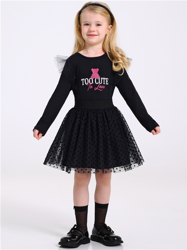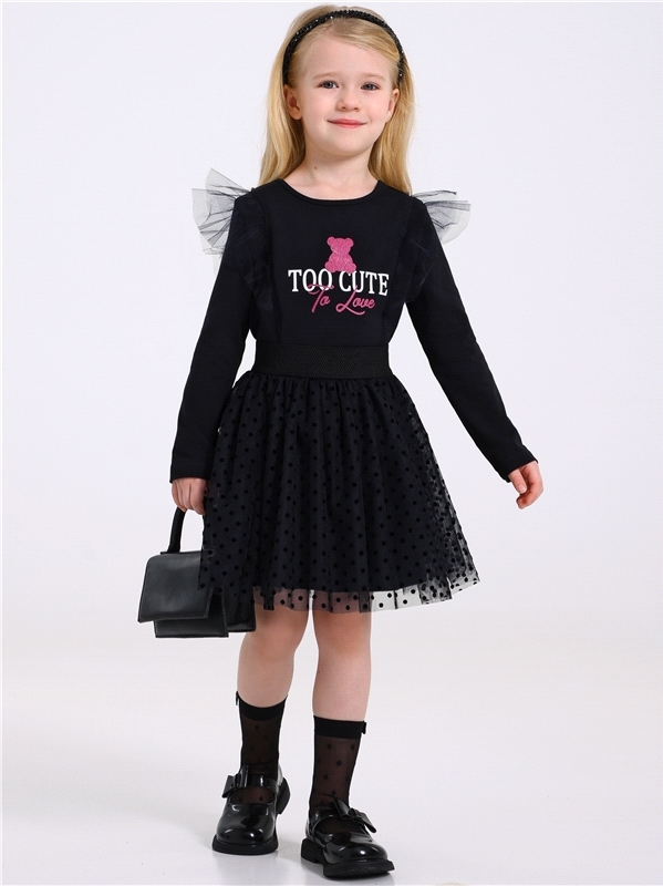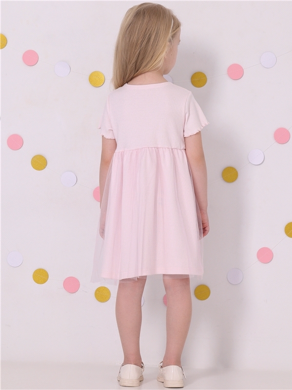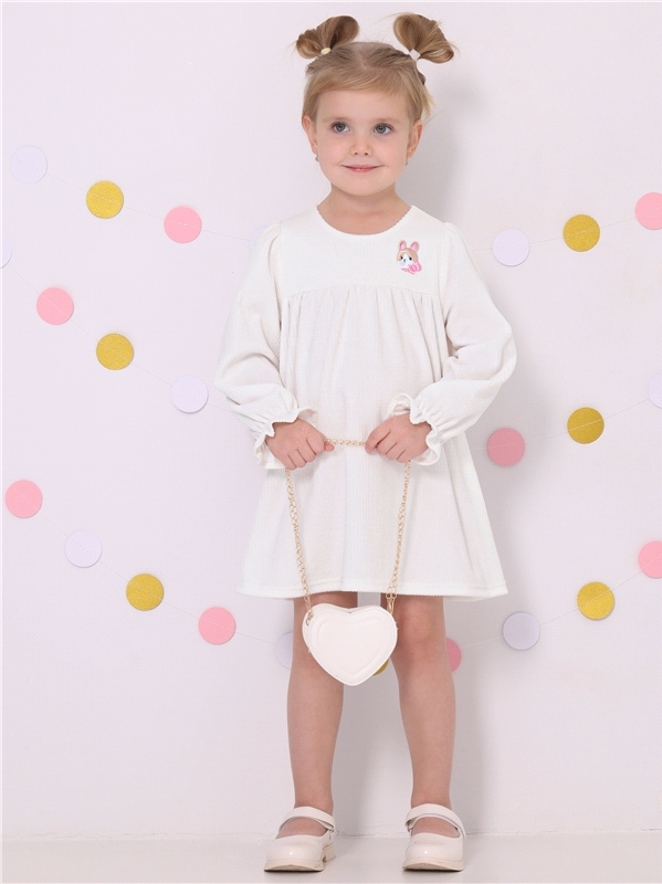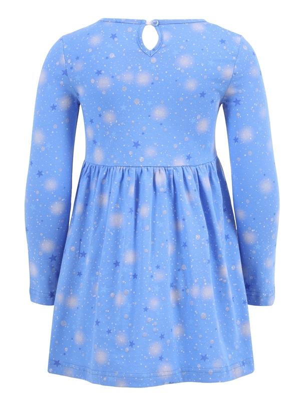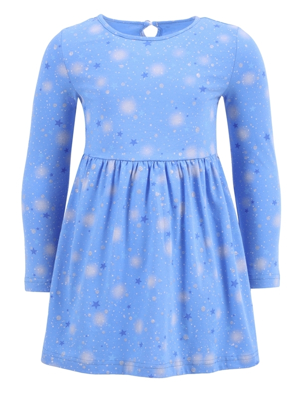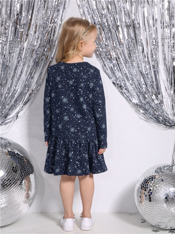 Платье для девочки выполнено из кулира – лёгкого хлопкового полотна с лайкрой. Изделие с длинными рукавами и с присборенной по талии юбочкой:застежка на пуговицу по спинке:украшено печатью на глитерно... Показать описанием полотне. Уход: деликатная стирка при температуре 40 градусов:без предварительного замачивания. Изделия с печатью и декором перед стиркой необходимо вывернуть на изнаночную сторону. Состав: кулир с лайкрой / хлопок 92% + лайкра 8%.
