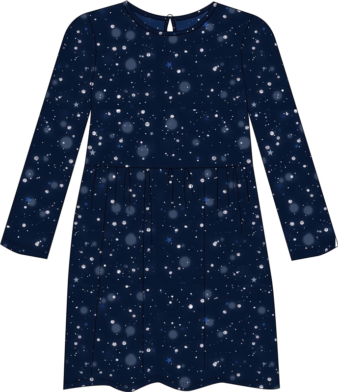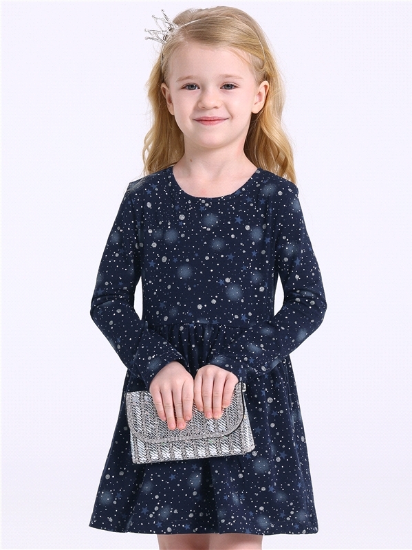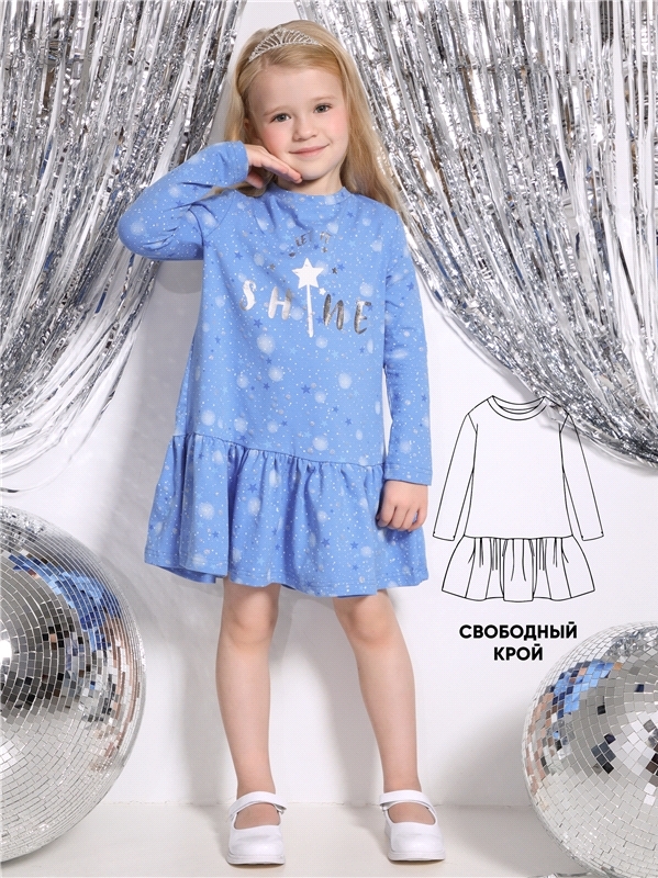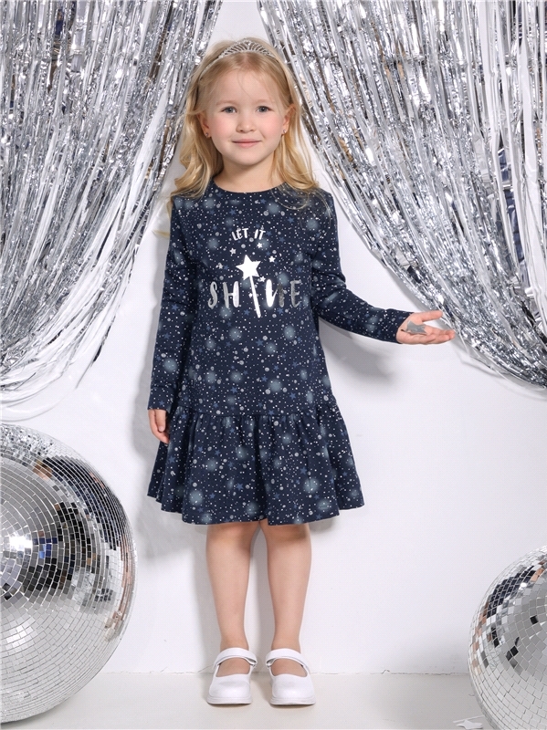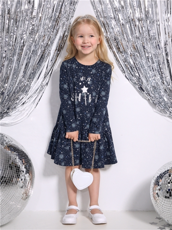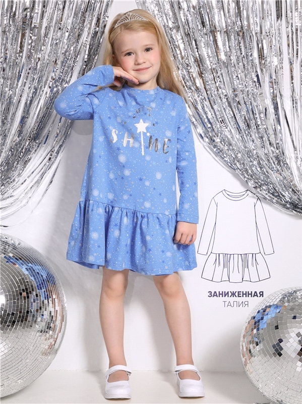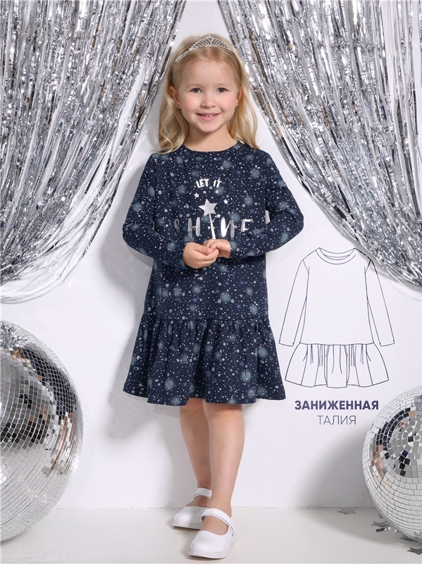 Платье для девочки выполнено из кулира- легкого хлопкого полотна с лайкрой. Изделие трапециевидного силуэта:с заниженной линией талии:с присборенной юбочкой:длинные рукава со спущенной линией плеча:ук... Показать описаниерашено печатью на полотне с глиттером. Уход: только деликатная стирка при температуре 40 градусов:без предварительного замачивания. Изделия с печатью и декором перед стиркой необходимо вывернуть на изнаночную сторону. Состав: кулир с лайкрой / хлопок 92% + лайкра 8%.
