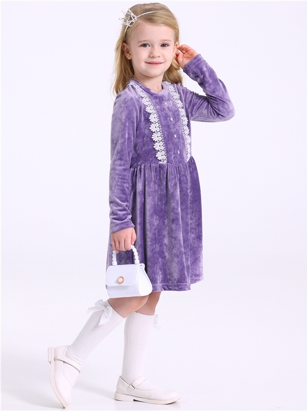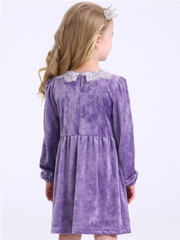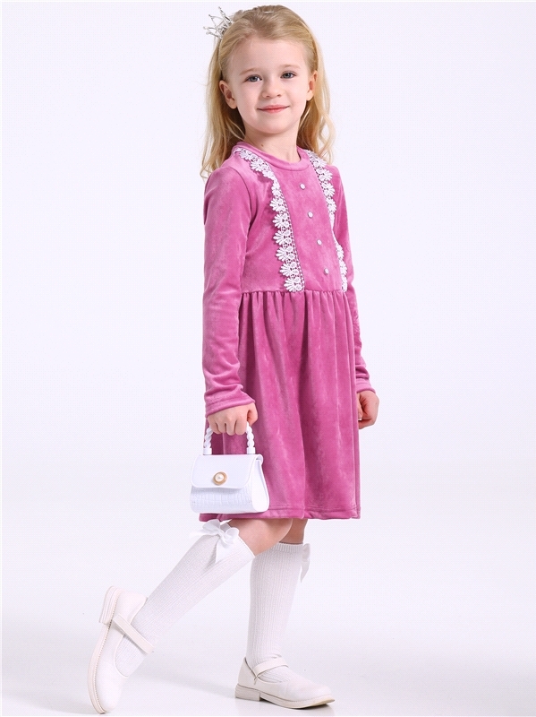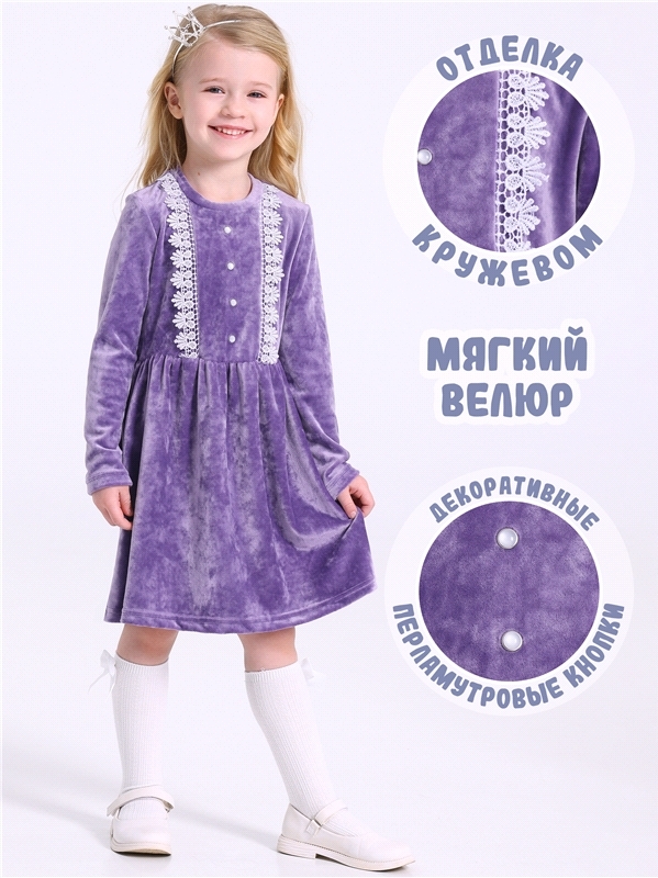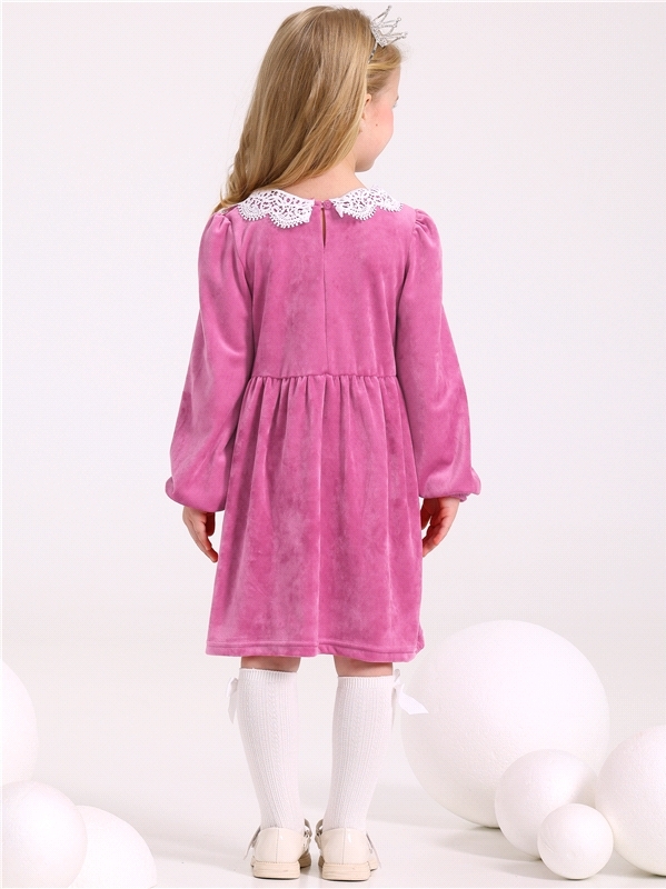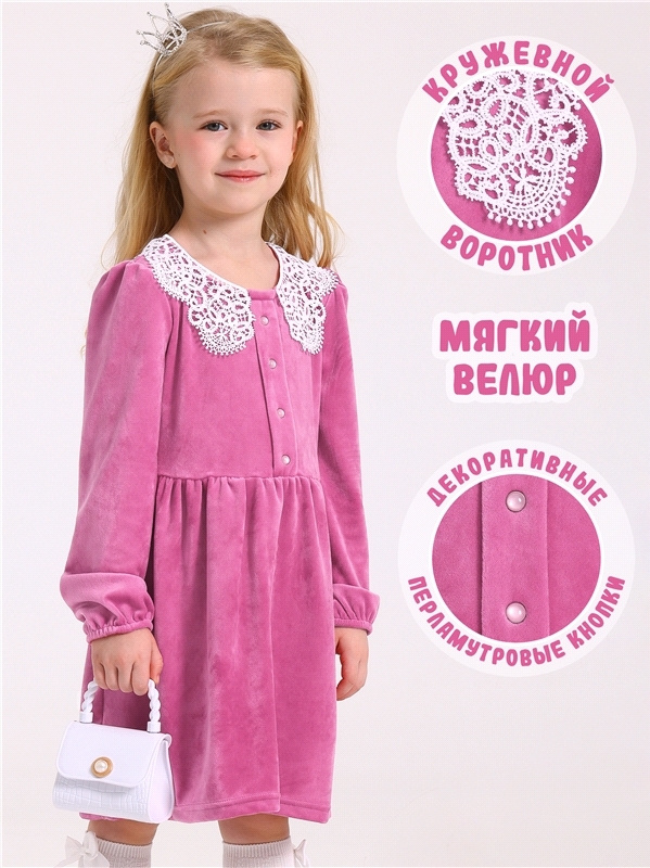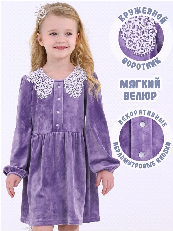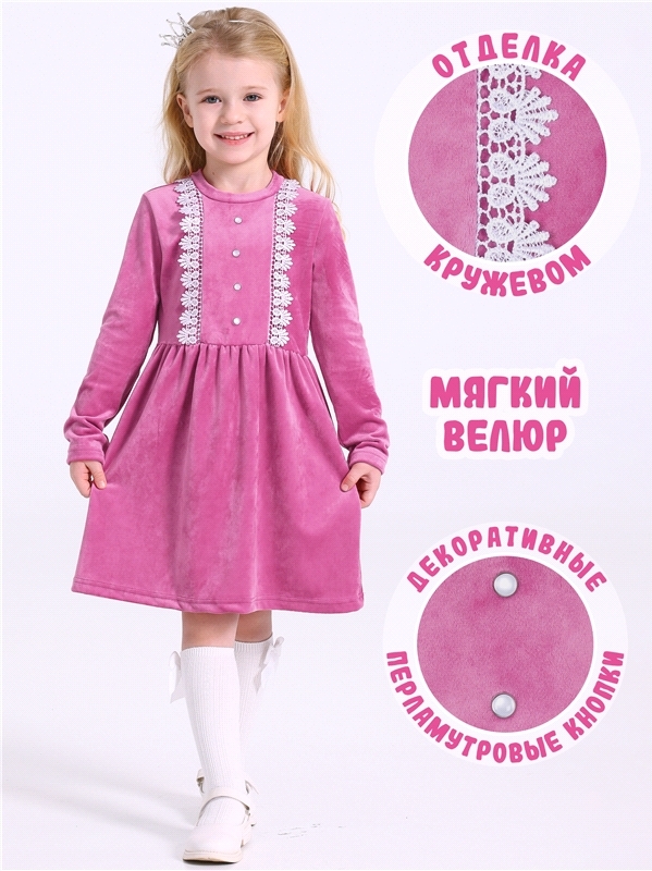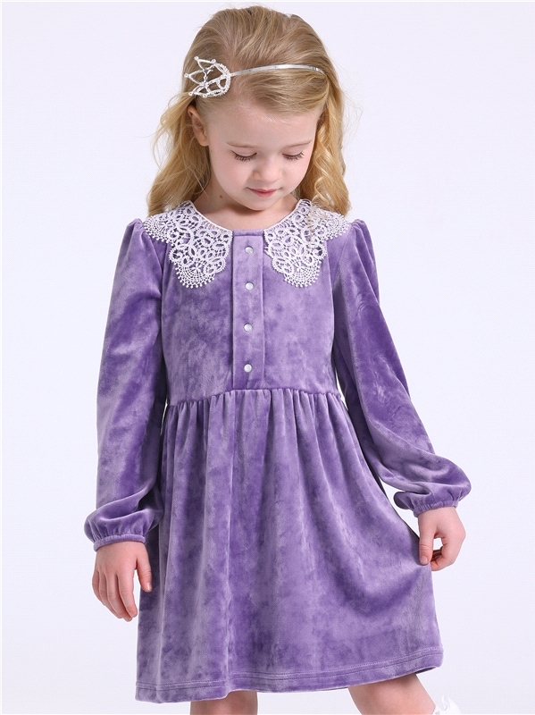 Платье для девочки выполнено из мягкого велюрового полотна. Изделие полуприлегающего силуэта:отрезное по линии талии с присборенной юбочкой:с длинными рукавами:собранными по низу на эластичную тесьму:... Показать описаниезастежка по спинке на пуговицу. Полочка платья украшена декоративной планкой с 4 перламутровыми кнопками и кружевным воротником. Уход: деликатная машинная стирка (руками не стирать!) при температуре 40 градусов:без предварительного замачивания. Изделия с печатью и декором перед стиркой необходимо вывернуть на изнаночную сторону. Состав: велюр / ПЭ 97% + лайкра 3%.