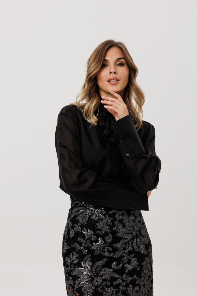Состав: ПЭ-100%; Блузка выполнена из гипюра с пайетками. Блузка прямого силуэта, длиной до линии бедер. Спереди застежка на пуговицы. Спинка цельная. Воротник стояче-отложной. Плечевой шов удлинен. Ру... Показать описаниекав втачной, одношовный со складкой и прорезью по низу. Низ рукава на притачной манжете, застегивающейся на две пуговицы. Длина блузки: 70 см. Длина рукава: 78 см. Гарантийный срок не установлен ГОСТ 25294 - 2003 Размерный ряд 44 46 48 Длина по центру спинки 70 70 70 Длина рукава от горловины 78 78 78 Объем по груди 98 102 106 Объем по талии 99 103 107 Объем по низу 104 108 112 Объем рукава вверху 33 35 37