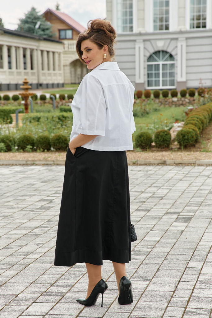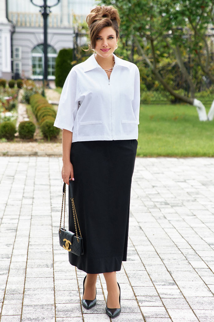 Состав: Блуза: Спандекс-3%; Хлопок-66%; Нейлон-31%; Юбка: Спандекс-5%; Хлопок-55%; ПА-40%; Модель отшивается под заказ. Срок пошива от 3 недель. Этот комплект состоит из безупречной белой блузки и кла... Показать описаниессической черной юбки А-силуэта. Блузка свободного кроя, с центральной застёжкой на тесьму-молнию по центру переда. Воротник в блузке рубашечного типа. По переду блузки имитация кармана, декоративные листочки. По спинке отрезная кокетка. Рукав цельнокроеный, длиной ?. В блузке фигурные вставки «бочки» с отстрочкой, что обеспечивает шикарный и непринужденный вид. Юбка расклешенная к низу юбка А-силуэта изящно подчеркивает талию и создает женственный силуэт, а длина «миди» открывает щиколотки, добавляя образу легкости. По переду юбки средний шов с застёжкой на тесьму-молнию в гульфике и пуговицу в поясе. Пояс в юбке притачной со вставкой эластичной тесьмы резинки в бочках. По переду фигурная кокетка и наклонные карманы. Заднее полотнище юбки со средним швом и фигурной кокеткой. По низу юбки притачная планка. Блузка    50 52 54 56 58 60 обхват груди    130 134 136 140 144 148 обхват бедер (низ)    118 122 126 130 134 138 ширина рукава вверху    44 46 48 48 50 32 Юбка    50 52 54 56 58 60 длина юбки    87 87 87 87 87 87 ширина юбки по талии в растянутом виде 92 96 100 104 108 112 ширина юбки на уровне бедер    115 119 123 127 131 135