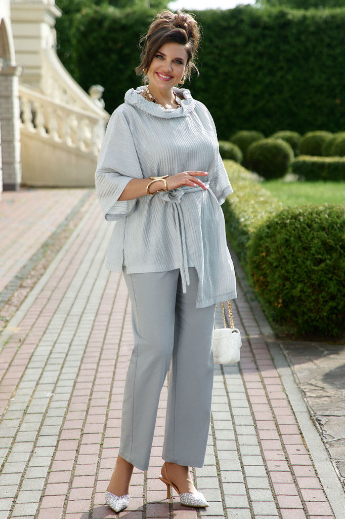 Состав: Блуза: Вискоза-70%; ПЭ-30%; Брюки: ПЭ-26%; Спандекс-2%; Хлопок-72%; Брюки: Хлопок-100%; Модель отшивается под заказ. Срок пошива от 3 недель. Основой ансамбля является блузон из высококачестве... Показать описаниенной ткани гофре, создающей интересную плиссированную текстуру и придающей объем. Его свободный крой и широкие рукава обеспечивают комфорт и современный силуэт. Горловина округлой формы с воротником по форме  «хамут ». Рукав ассиметричный (левый цельнокроеный, правый втачной со спущенной линией плеча.), длиной ?. По переду и спинке блузки вертикальный рельеф. Низ ассиметричный. В боковых швах карманы. Блузон дополнен поясом из той же ткани с декоративным элементом, который позволяет подчеркнуть талию и создать более женственный образ. Завершают комплект стильные джинсы выполненные в тон блузе, брюки прямого силуэта, по переду застежка на тесьму молнию в гульфике и пуговицу в поясе. По переду брюк наклонные карманы. Пояс притачной со шлёвками, вставкой эластичной тесьмы резинки в «бочках» пояса и вставкой фигурной кокетки по задним деталям брюк. По задним половинкам брюк накладные карманы. Длина блузы по длинной стороне 86 см (р 52-56), 87 см (р 58-62), по короткой стороне 70 см (р 52-56), 71 см (р 58-62). Длина рукава 44 см (р 52-56), 45,5 см (р 58-62). Длина брюк по боковому шву от шва притачивания пояса 98 см. Блузка    52 54 56 58 60 62 обхват груди    132 132 132 148 148 14 ширина изделия внизу    136 136 136 148 148 148 ширина рукава внизу    47 47 47 48,6 48,6 48,6 длина по длинной/короткой стороне    86/70 86/70 86/70 87/71 87/71 87/71 Брюки    52 54 56 58 60 62 длина  по боковому шву  без резинки    98 98 98 98 98 98 ширина по талии     84/102 88/106 92/110 96/114 100/118 104/122 ширина на  уровне среднего шва    116 120 124 128 132 136