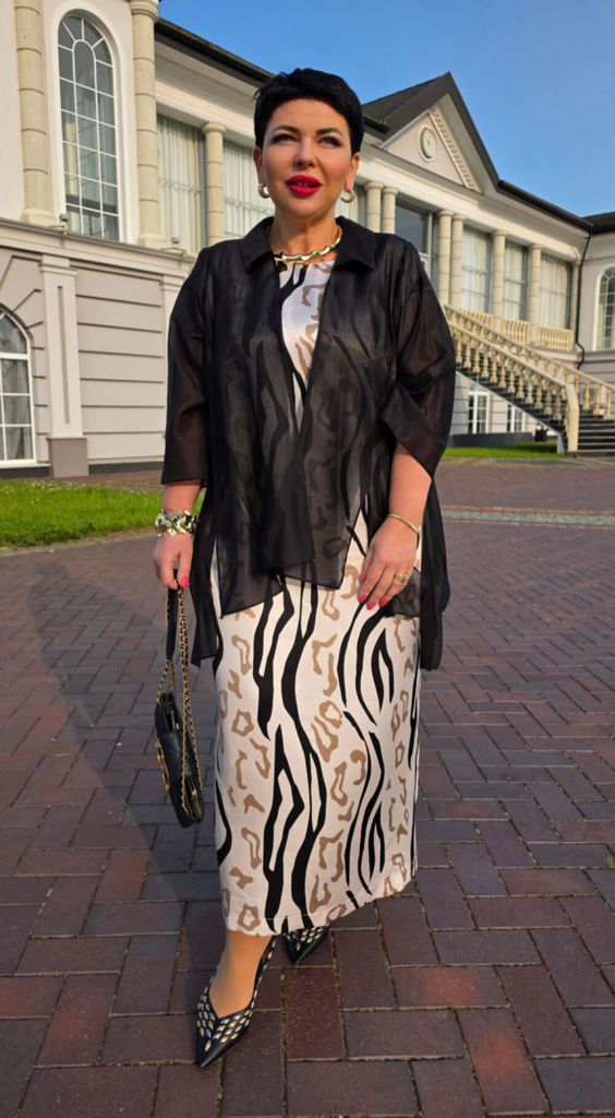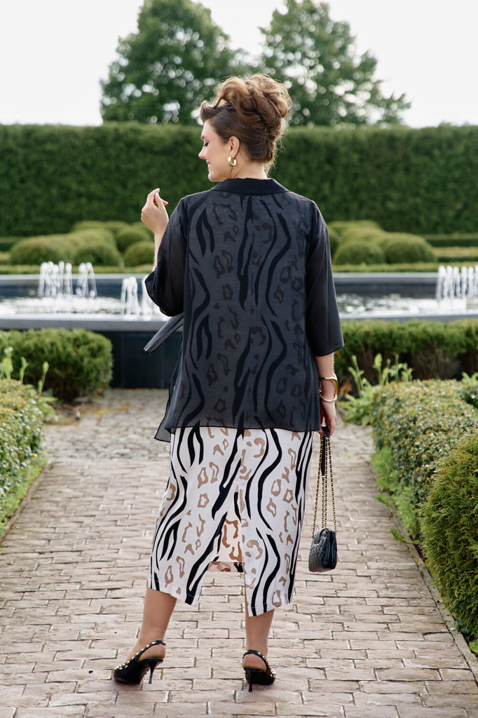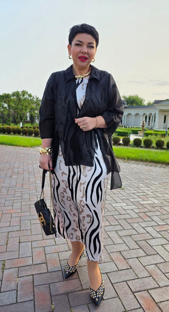 Состав: Блуза: Вискоза-83%; ПЭ-17%; Платье: Вискоза-50%; Район-50%; Модель отшивается под заказ. Срок пошива от 3 недель. Комплект состоящий из полупрозрачной блузки-накидки и платья с анималистически... Показать описанием принтом. Прямой силуэт платья длиной миди делает его универсальным для различных мероприятий, а отсутствие рукавов позволяет носить его как самостоятельно, так и в сочетании с жакетами или накидками. Круглый вырез горловины добавляет образу лаконичности и утонченности. Перед блузки состоит из разрезных и отлетных деталей без застежки. Воротник по горловине отложной. Рукав одношовный, по шву с 3 складками низ широкий свободный. Боковой шов с ассиметричным разрезом. Спинка блузки цельная. Платье прямое без рукава со спущенным плечом по переду с нагрудной выточкой для максимально комфортной посадки. Спинка платья со средним швом и разрезом понизу. Блуза    52 54 56 58 60 62 обхват груди    131 135 139 143 147 151 длина по спинке    73 73 73 74 74 74 ширина рукава вверху    48 50 52 54 56 58 Платье    52 54 56 58 60 62 длина спинки    122,5 122,5 122,5 123,5 123,5 123,5 обхват груди    116 120 124 126 130 134 обхват талии    112 116 120 124 128 132 обхват бедер     124 128 132 136 140 144