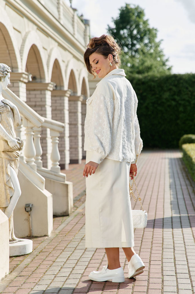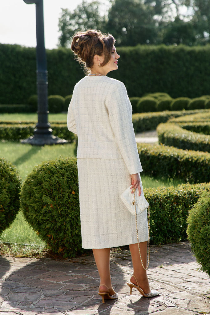 Состав: Костюм: ПЭ-53%; Хлопок-17%; Акрил-30%; Подкладка: ПЭ-100%; Модель отшивается под заказ. Срок пошива от 3 недель. Костюм антично-белого оттенка и серебристой  нити с трендовым декором на л... Показать описаниеевом плече. В крупные металлические люверсы проходят цепи и жемчужная нить. Жакет прямого силуэта с нагрудной вытачкой из низа и бочком. Застёжка однобортная на две петли и пуговицы с V-образной горловиной без воротника. Рукав полной длины двухшовный пиджачный. Спинка жакета с двумя талиевыми выточками. Юбка прямая зауженная к низу длины миди по переду комфортная шлица, задняя часть юбки со средним швом и потайной молнией в верхней части также талиевые вытачки. Юбка имеет приточной пояс по боковой части на резинке, что придает комфорт. Топ выполнен из лёгкой шелковистой ткани. Передняя часть топа имеет нагрудную вытачку, горловина округлой формы. Бретель топа достаточно широкая что скрывает недостатки. Длина жакета по спинке 55 см (р 48-52), 55,5 см (р 54-58), длина рукава 61,5 см. Длина топа по спине 63 см. Длина рукава топа 8 см.  Длина юбки 75 см (р 48-52), 76 см (р 54-58).                                              Жакет    48 50 52 54 56 58 обхват груди    106 110 114 118 122 126 длина спинки    55 55 55 55,5 55,5 55,5 ширина изделия внизу    115 119 123 127 131 135 обхват талии    106 110 114 118 122 126 Юбка    48 50 52 54 56 58 длина юбки    75 75 75 76 76 76 ширина юбки по талии    78/92 80/96 84/100 88/104 92/108 96/112 ширина юбки на уровне бедер    113 117 121 125 129 133 Топ    48 50 52 54 56 58 обхват груди    103 107 111 115 119 123 обхват талии    103 107 111 115 119 123 ширина изделия на уровне бедер    110 114 118 122 126 130