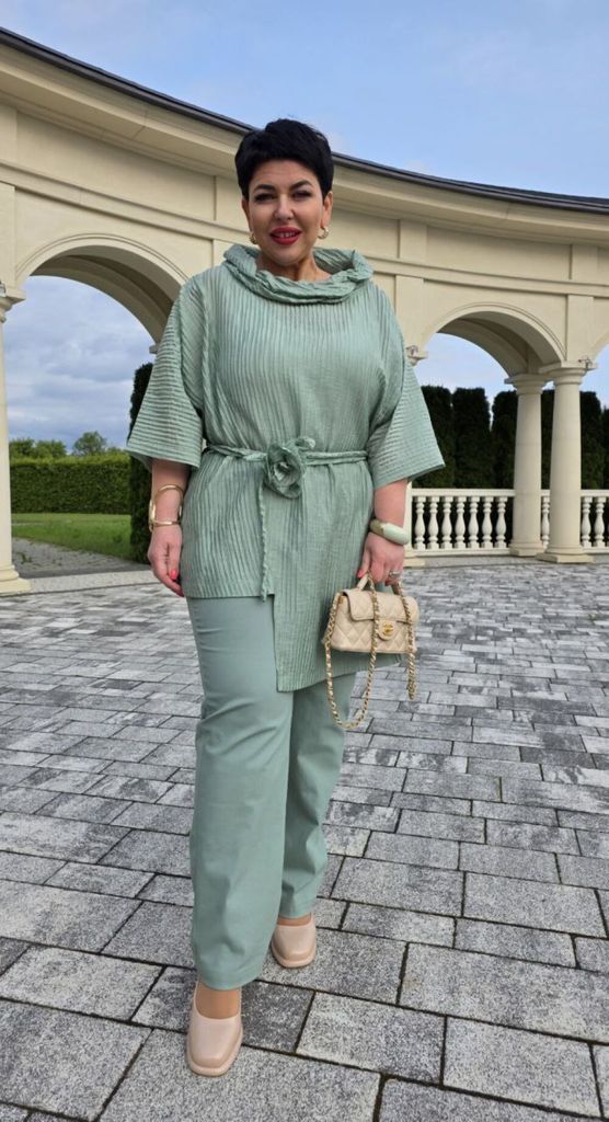 Состав: Блуза: Вискоза-60%; Спандекс-5%; ПА-35%; Брюки: Вискоза-100%; Модель отшивается под заказ. Срок пошива от 3 недель. Летний комплект, состоящий из блузки и прямых брюк в ярком дизайне олицетвор... Показать описаниеяет собой идеальный летний наряд. Этот летний комплект становится не просто одеждой, а полноценным выражением личного стиля, способностью наслаждаться каждой минутой. Он подходит как для прогулок по городу, путешествий, так и для работы в офисе. Подчеркивая всю грацию и утонченность своей обладательницы. Совершенное сочетание удобства и эстетики делает его идеальным выбором для современных женщин, стремящихся к гармонии в каждом аспекте своей жизни. Блуза прямого силуэта, с округлой формой горловины. Рукав спущенный, удлиненная линия плеча с притачной манжетой по низу. Спинка без особенностей. По переду блузы- декоративный элемент в виде дизайнерской печати. Брюки прямого силуэта, свободные, буквально не ощущаются на теле. Пояс в брюках притачной на эластичной тесьме-резинке, что обеспечивает максимально удобную посадку на любой тип фигуры. По переду брюк прорезные карманы. Длина блузы от верхней точки плечевого шва до низа 66 см (р.50-54), 67 (р.56-60). Длина рукава от горловины 26,5 см (р.50-54), 29,5 см (р.56-60).Длина блузки 72,5 см (р.50-54), 79,5 см (р.56-60). Длина рукава (плеча) 26,5 см (р.50-54), 29,5 см (р.56-60). Длина брюк 108 см (р.50-54), 108,5 см (р.56-60) блуза    50 52 54 56 58 60 обхват груди    116 120 124 128 132 136 обхват талии ширина изделия внизу    122 126 130 134 138 142 брюки    50 52 54 56 58 60 ширина в собранном виде    76 80 84 88 92 96 ширина в растянутом виде    110 114 118 122 126 130 ширина на  уровне среднего шва    122 126 130 134 138 140