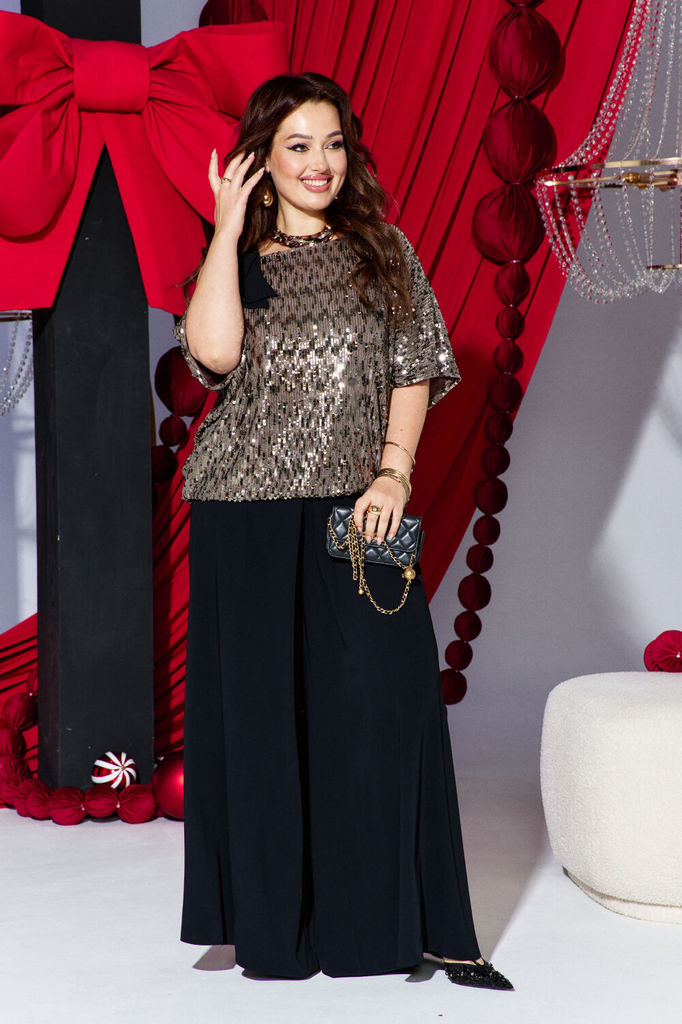Состав: Блуза: ПЭ-100%; Брюки: ПЭ-100%; Модель отшивается под заказ. Срок пошива от 3 недель. Это стильный и современный ансамбль, который состоит из блузы и брюк. Изысканный женский комплект идеален ... Показать описаниедля торжественных мероприятий, он станет жемчужиной вашего гардероба. Брючный комплект можно дополнить минималистичными украшениями, которые подчеркнут утончённость, завершая этот элегантный, но уверенный образ. Сочетание классического чёрного цвета со сверкающими пайетками в одном образе превратит обыденное событие в настоящий феерический праздник! Блуза (состав: 100% полиэстер) выполнена из мерцающих пайеток богатого кофейного оттенка создаёт невероятно праздничный образ. Блуза свободного силуэта с асимметричной формой горловины: одно плечо открыто, расположен декоративный элемент чёрного цвета из отделочной ткани. Рукав цельнокроеный. Спинка без особенностей. Блуза на подкладке. Брюки (состав: 100% полиэстер) свободного кроя выполнены из плотной, матовой ткани чёрного цвета. Их широкий фасон и высокая посадка на талии создают элегантный и удлинённый силуэт, а также контрастируют с лёгким и воздушным верхом. Пояс в брюках притачной со вставкой эластичной тесьмы-резинки в бочках. По переду брюк от пояса застрачивается складка. В среднем шве брюк застёжка на потайную тесьму молнию и пуговицу в поясе. Длина блузы 56,5 см (р 52-56), 57,5 см (р 58-62), длина рукава 36,5 см (р 52-56), 37,5 см (р 58-62). Длина брюк 108 см. Блуза    52 54 56 58 60 62 ширина на уровне проймы    194 194 194 202 202 202 обхват бедер    122 126 130 134 138 142 Брюки    52 54 56 58 60 62 ширина по талии    84/98 88/102 92/106 96/110 100/114 104/118 обхват бедер    122 126 130 134 138 142