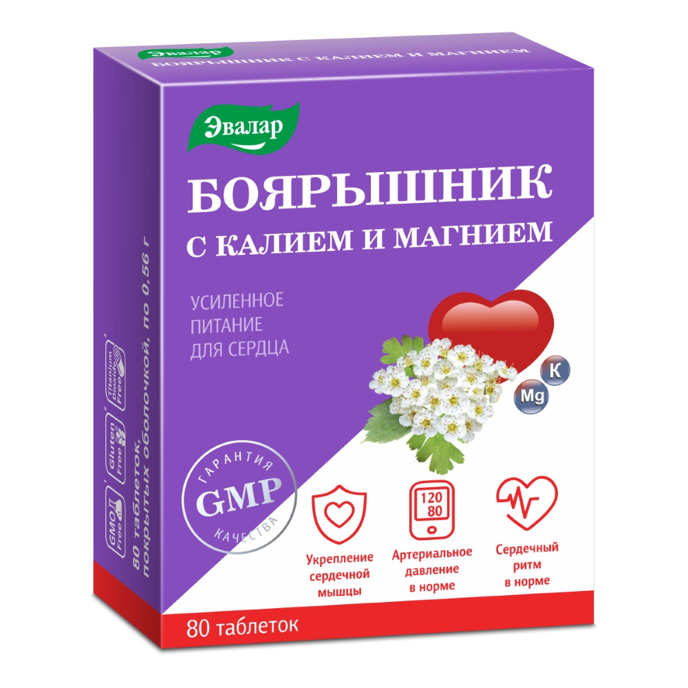 Боярышник с калием и магнием для питания для сердца. Активное вещество: экстракт цветков и листьев боярышника, аспарагинат магния, аспарагинат калия. Действие: укрепление сердечной мышцы, поддержание ... Показать описаниев норме артериального давления и сердечного ритма. ОПИСАНИЕ: Ежедневно наше сердце получает огромное количество нагрузки, и не всегда эта нагрузка соизмерима с его силами. Статистика смертности от сердечно-сосудистых заболеваний только молодеет. Чтобы укрепить сердце и повысить его выносливость и работоспособность, выбирайте Боярышник с калием и магнием от компании «Эвалар». В нем действие боярышника усилено «витаминами для сердца» - калием и магнием. Такой комплекс усиленно питает и укрепляет сердце, делая его более сильным и выносливым и способствует поддержанию работы сердечной мышцы в норме. Как работают ингредиенты? Боярышник (цветки, листья), благодаря совокупному действию биологически активных веществ, таких как оксикоричные кислоты, флавоноиды, гликозиды, дубильные вещества, сапонины и некоторых других, способствует укреплению и питанию сердца. Кроме того, взаимодействие всех содержащихся в боярышнике веществ поддерживает ритм работы сердца. Калий и магний - микроэлементы, необходимые для нормальной жизни всех клеток организма человека. Они имеют важное значение и в работе сердечно-сосудистой системы. На протяжении жизни постоянно возникают ситуации, связанные с нехваткой или повышенными потерями калия и магния или с повышенной потребностью в этих элементах: интенсивная нагрузка, стресс и другие. При недостатке калия и магния нарушается естественная работа сердечной мышцы, ей трудно получить кислород и те питательные вещества, которые доставляются с кровью. Поэтому необходимо восполнить дефицит калия и магния в организме. Продукты, которыми мы питаемся, содержат небольшое количество данных микроэлементов. Поэтому помимо употребления продуктов, содержащих калий и магний, требуется дополнительный прием препаратов калия и магния для питания и укрепления сердца. Содержание в 4 таблетках (суточном приеме) Экстракт цветков и листьев боярышника 800 мг Аспарагинат магния 300 мг Аспарагинат калия 300 мг