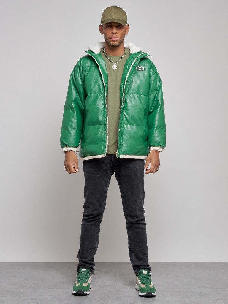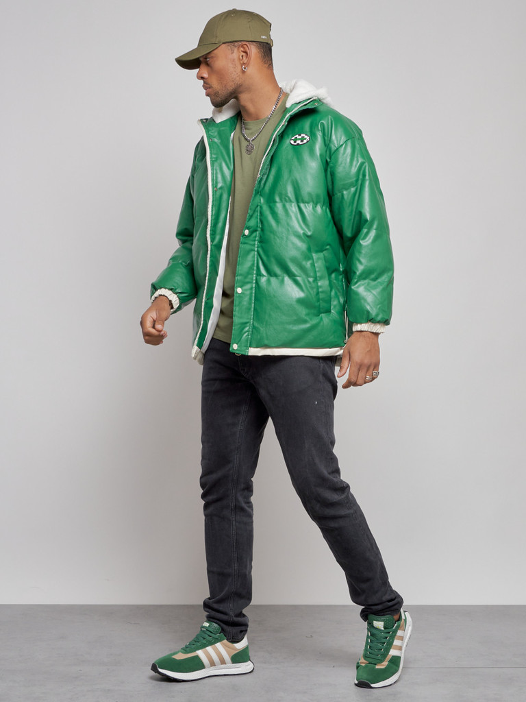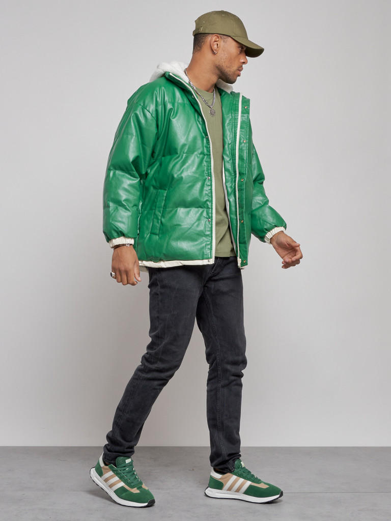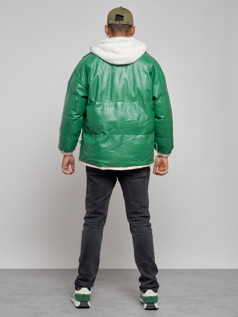 Куртка из экокожи мужская с плюшевым капюшон зеленого цвета 28132ZВопросы по товару