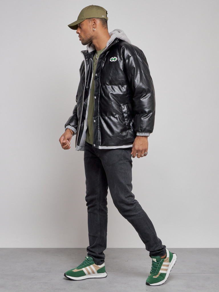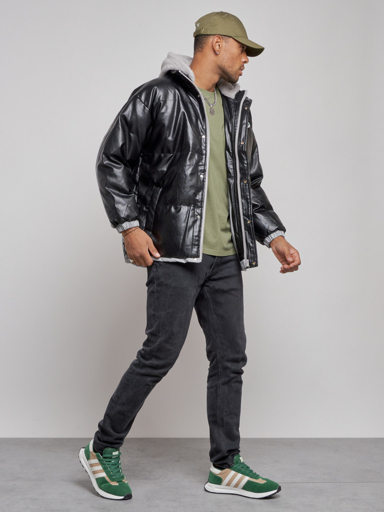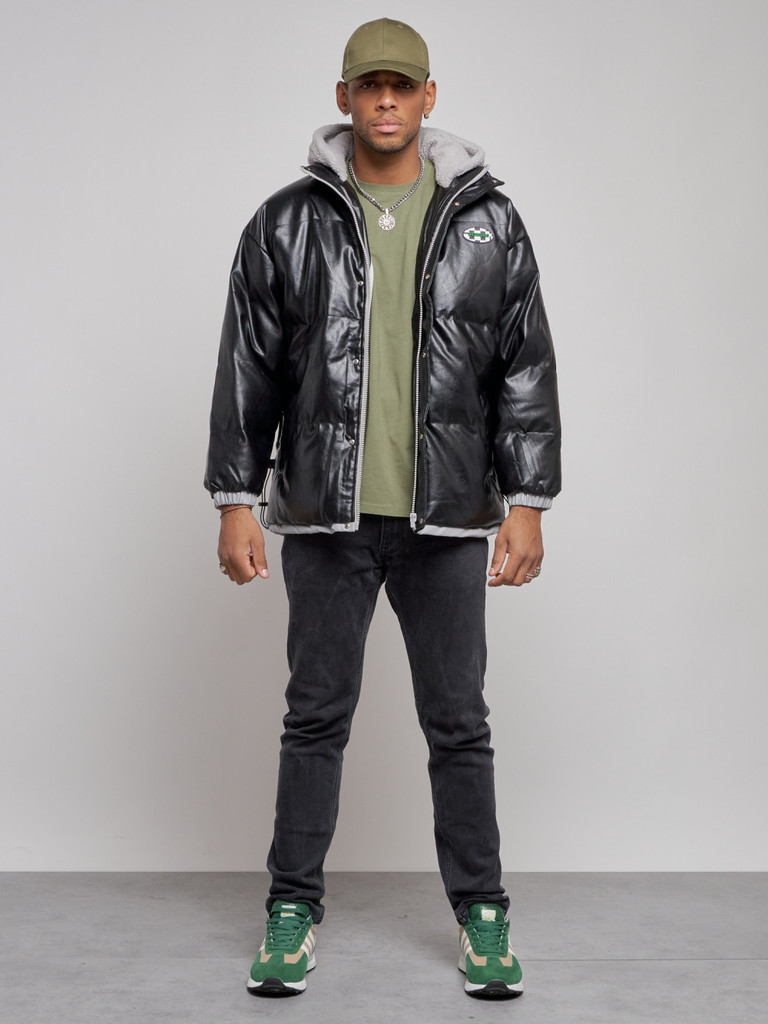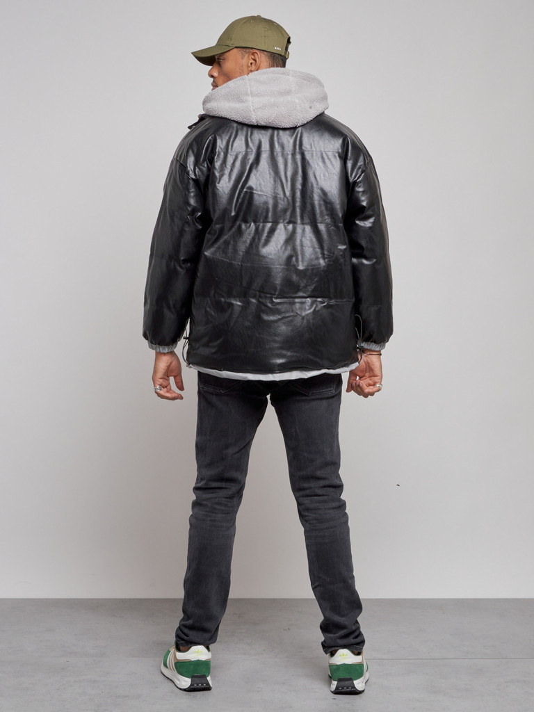 Куртка из экокожи мужская с плюшевым капюшон черного цвета 28132ChВопросы по товару