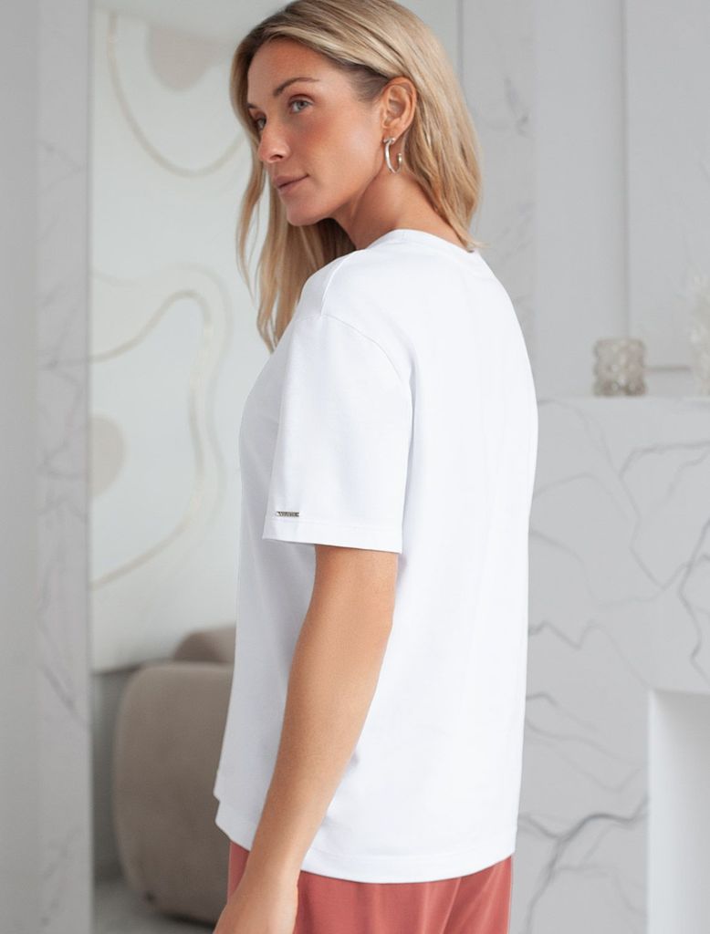 Состав: 92%Хлопок 8%ПУ Плотность: 170 Г/м2 Размер товара на первом фото: 42 Футболка белого цвета изготовлена из премиального хлопка с эластаном, она обеспечивает невероятное ощущение уюта и легкости.... Показать описание Натуральный материал сохраняет форму и цвет после множества стирок, обеспечивая долговечность изделия, а его высокая воздухопроницаемость создает ощущение свежести даже в течение долгого дня. Особое внимание привлекает стильный принт в виде бабочки с минималистичной надписью. Перевод надписи Let your dreams be your wings - Пусть твои мечты станут твоими крыльями. Принт выполнен красками с устойчивым покрытием, который добавляет изделию оригинальности и позволяет выразить индивидуальность. Свободный крой футболки дарит удобство и не стесняет движений, что делает ее идеальной для повседневной носки или активного отдыха, подчеркивает современный взгляд на моду. На рукаве металлический логотип бренда. Подойдет девушкам и женщинам на любую фигуру, вы будете чувствовать себя в ней уверенно и комфортно. Отлично впишется в гардероб благодаря универсальному дизайну, который легко сочетать с джинсами, шортами или спортивными брюками.
