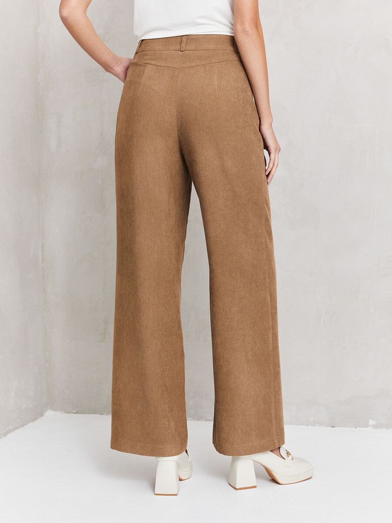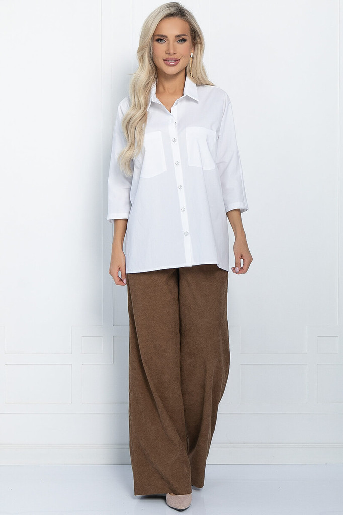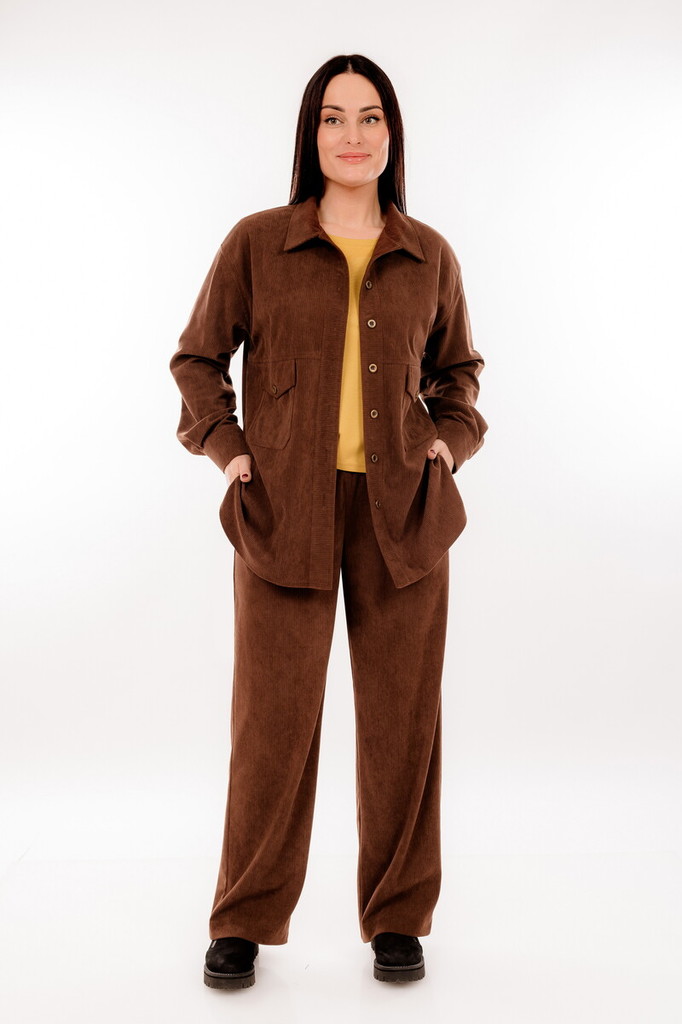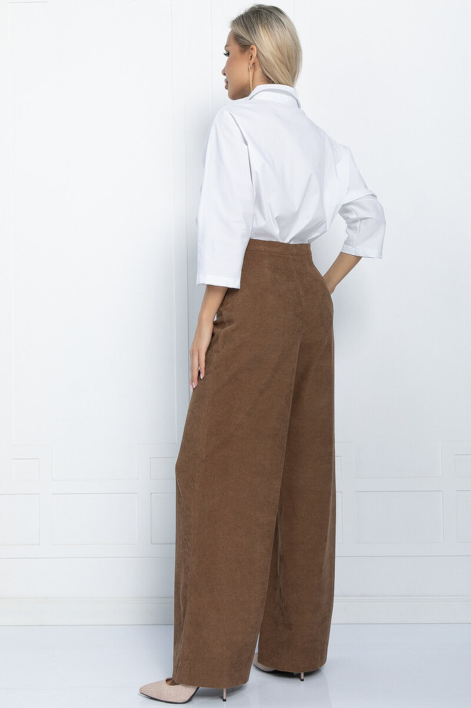 Широкие брюки неяркого коричневого оттенка длиной в пол – идеальный вариант для весеннего гардероба. Высокая посадка визуально удлиняет силуэт. Для изготовления модели с фигурной кокеткой на спинке и ... Показать описаниезакругленными боковыми карманами, как у джинсов, использовали мягкий микровельвет на основе вискозы. Застежка – гульфик, шлевки для кожаного ремня. На фото представлены с жилетом В-91 ВЛК(В4) и джемпером С-41 СКР(В4).