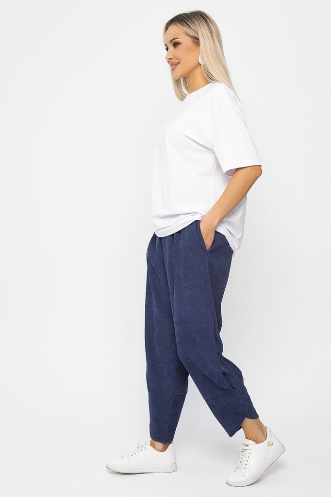Артикул: Б10269. Ткань: микровельвет. Состав: 98% п/э, 2% эластан. Цвет: синий. Вид застежки: отсутствует. Силуэт: свободный. Карманы: есть. Длина изделия по боковому шву: 44/ 88 см, 46/ 89 см, 48/ 90... Показать описание см, 50/ 91см, 52-54/ 92 см. Рост модели: 168 см. Объемные брюки в стиле бохо - это свободный непринужденный стиль современной моды. Шароварный силуэт создается за счет резинки по талии, свободной посадки в бедрах, бокового защипа по низу и оригинального высокого манжета в виде тюльпана. Свободные, прямые, просторные брюки бананы выгодно подчеркивают женские формы и скрывают недостатки. Комбинируйте их с различными видами топов, джемперов, блузок или футболок. Брюки выполнены из комфортной в носке ткани, которая не вытягивается и не деформируется после стирки. Уход за изделием: ручная стирка до 30 градусов; нельзя отбеливать; деликатный отжим; гладить при t не более 110С; гладить с изнанки. *Допуск отклонения длины при массовом производстве 1-3 см является нормой.