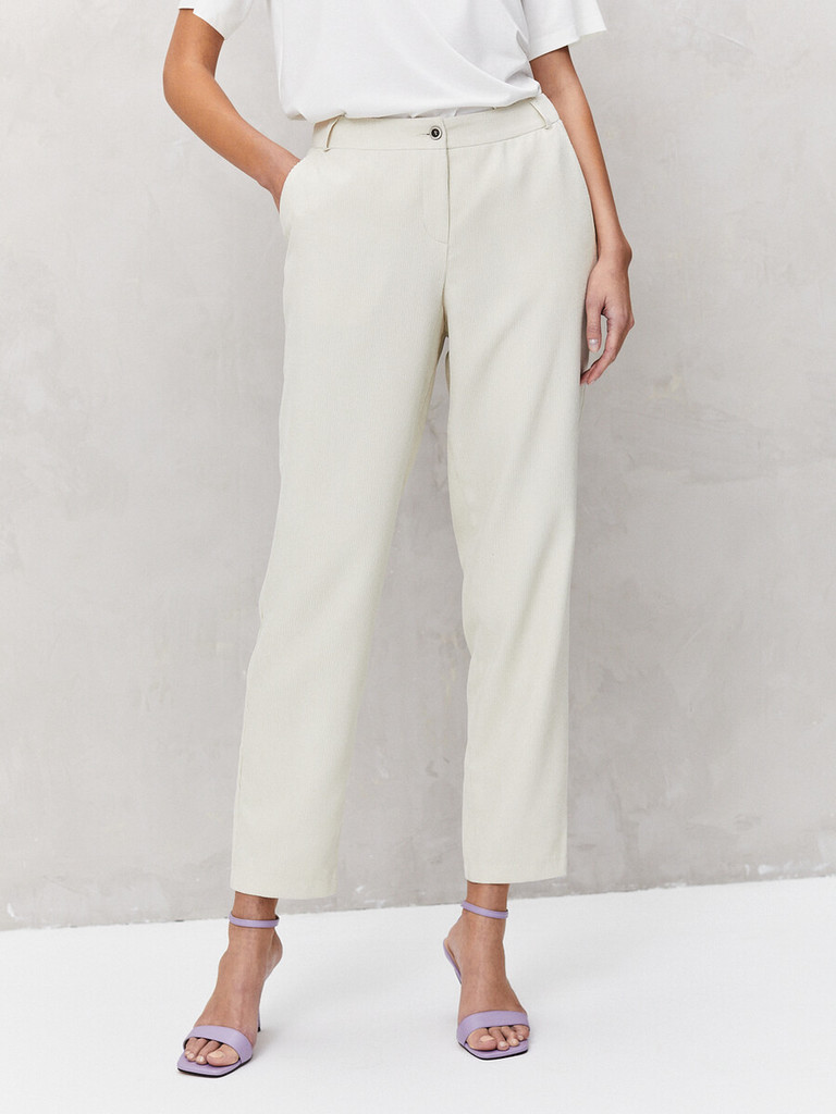 Зауженные брюки молочного цвета сшиты из мягкого микровельвета, который практически не мнется и комфортно облегает фигуру. Лаконичная однотонная модель с высокой посадкой застегивается на молнию. Боко... Показать описаниевые карманы, шлевки на поясе. Модель отлично дополняет образ с жакетом В-911 САВ(В4) и джемпером С-36 КВЛ(В4).