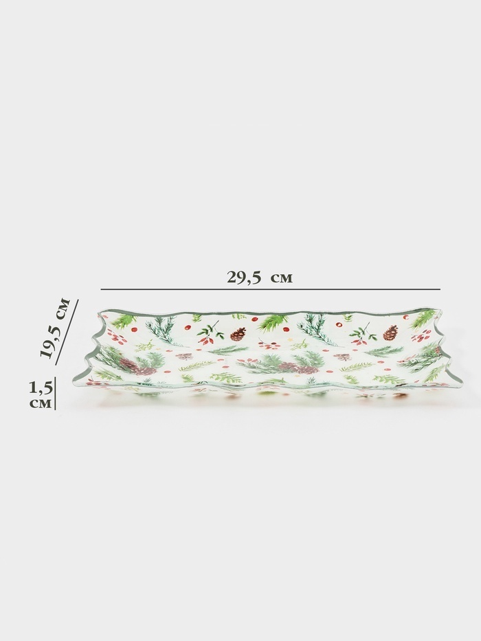 Создайте праздничную сервировку с атмосферой лесной сказки! Сервировочное блюдо — элегантное стеклянное решение для подачи закусок, десертов и нарезок в новогодние дни. Его прямоугольная форма и приро... Показать описаниедный узор подчеркнут уют домашнего праздника без излишеств. * Новогодний узор: дизайн вдохновлён зимним лесом — тонкие ветви ели в бело-зелёной гамме. Рисунок не вычурный, но сразу задаёт праздничное настроение, особенно в сочетании с деревянной посудой или льняным текстилем. * Удобный формат 29,5?19,5 см: прямоугольник вместит нарезку, сырную тарелку или мини-десерты. Такое блюдо не теряется на большом столе и не выглядит громоздко на маленькой сервировке. * Гладкое стекло: поверхность легко протереть влажной салфеткой, а гладкая текстура не собирает крошки и не искажает цвет продуктов. * Уход: изделие не предназначено для СВЧ и посудомоечной машины, рекомендуется только ручная мойка. Блюдо подойдёт для новогоднего ужина, рождественского бранча или зимнего фуршета. Оно не требует дополнительного декора — узор уже создаёт нужную атмосферу. Дополнительно Нельзя мыть в посудомоечной машине и использовать в СВЧ-печи. Рекомендуется мыть вручную без использования агрессивных моющих средств.