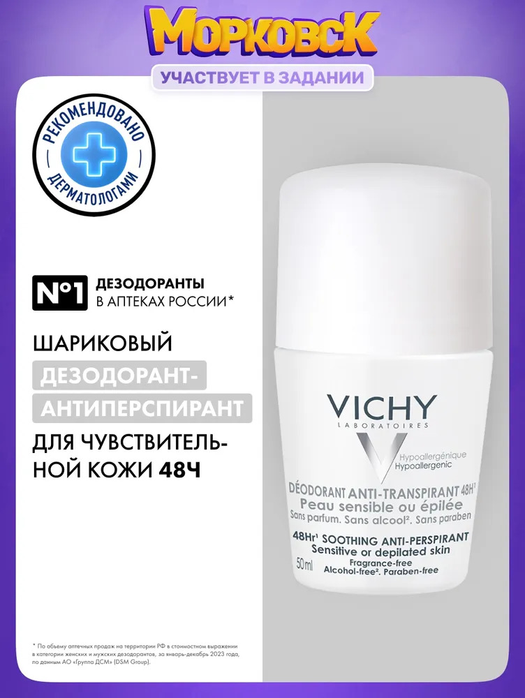 VICHY Дезодорант-антиперспирант 48ч шариковый против белых и желтых пятен, 50 мл. Вопросы по товару