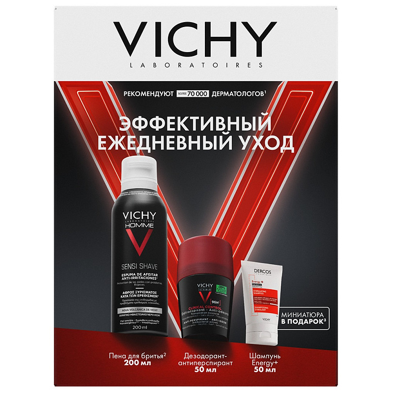 В набор входят три средства: Пена для бритья против раздражения кожи, 200 мл. Мужская пена для бритья обеспечивает гладкое скольжение лезвия по коже, позволяя бриться без раздражений и покраснений. Во... Показать описаниесстанавливает барьерно-защитные свойства кожи, увлажняет, обеспечивает антибактериальный эффект. Гипоаллергенная формула. Без парабенов. Протестировано под контролем дерматологов. Дезодорант-антиперспирант Clinical Control 96 ч, 50 мл. Средство с антибактериальными компонентами обеспечивает максимальный среди дезодорантов Vichy уровень защиты для мужской кожи. Антиперспирант - формула с клинически доказанной эффективностью обеспечивает сухость кожи в зоне подмышек и защищает от избыточного потоотделения до 96 часов.* Дезодорант - цинк в составе ограничивает размножение бактерий и защищает от неприятного запаха до 72 часов.** Двойное действие для ощущения комфорта в течение всего дня после использования. Гипоаллергенно. Шампунь тонизирующий с Аминексилом от выпадения волос. 200 мл Формула шампуня Energy+ содержит активные компоненты, воздействующие на кожу головы, корни волос и стержень волоса. Подходит для частого применения. Гипоаллергенно. Протестировано под контролем дерматологов. Можно использовать при чувствительной коже головы. Рекомендуется использовать в сочетании со средством против выпадения волос Aminexil Intensive 5 для мужчин и женщин.