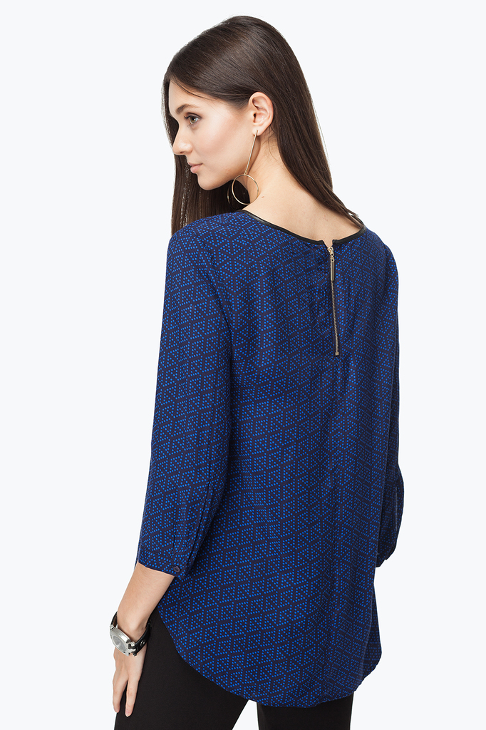 Состав: 100%Вис Блузка выполнена из мягкого вискозного полотна с эффектным дизайнерским принтом. Модель свободного силуэта с удлиненной спинкой и рукавами 3/4. На спинке застежка на золотистую молнию,... Показать описание на рукаве манжет с застежкой на пуговицу. Округлый вырез горловины с окантовкой из иск. кожи.
