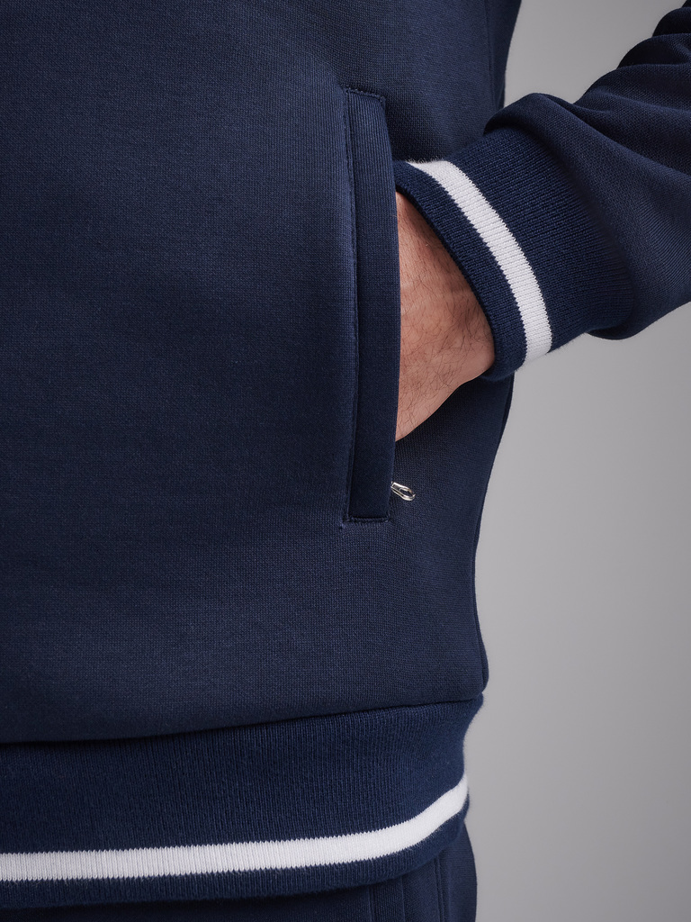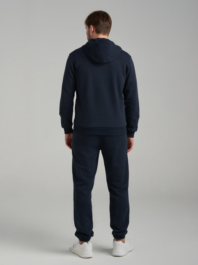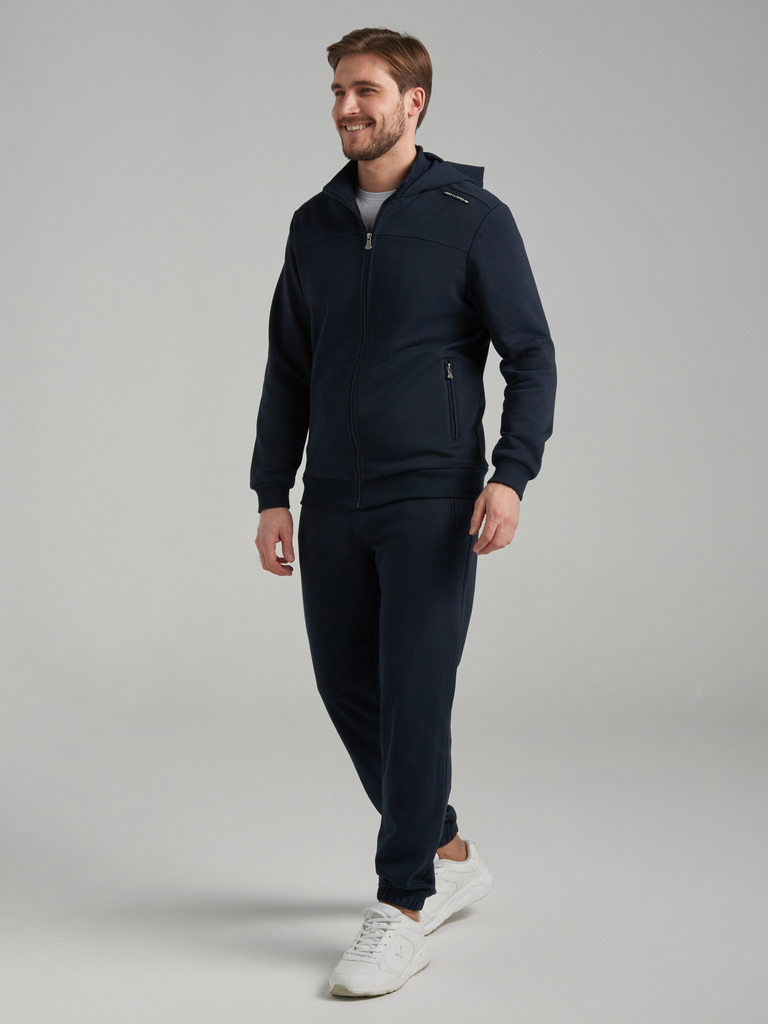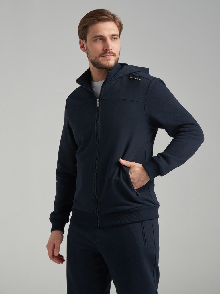 Мужско спортивный костюм из плотного хлопкового трикотажа с петельной изнанкой. Костюм состоит из куртки на молнии и брюк. Куртка свободного силуэта на поясе, с удобным капюшоном и воротником, рукава ... Показать описаниевтачные. Читать далее Карманы куртки и брюк с молниями. Низ брюк заужен на эластичную резинку. Задний карман брюк на молнии. В пояс брюк вшита резинка, ширина пояса дополнительно регулируется шнуром.