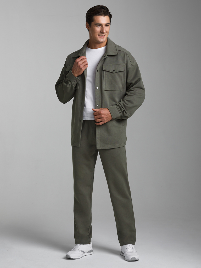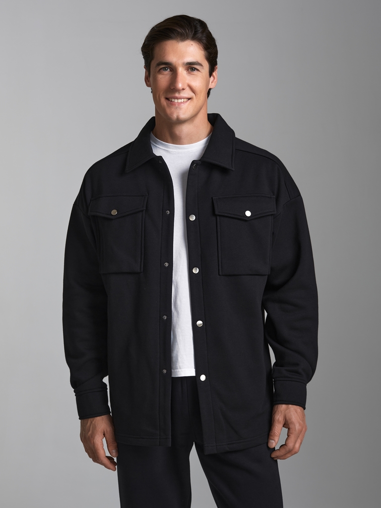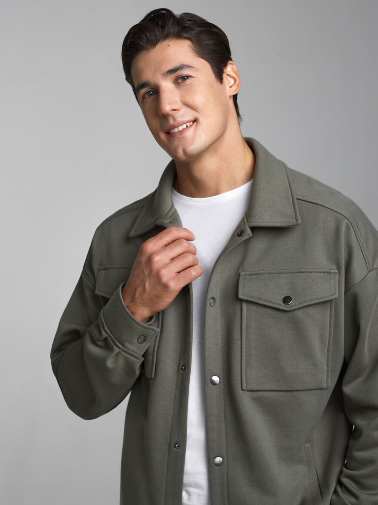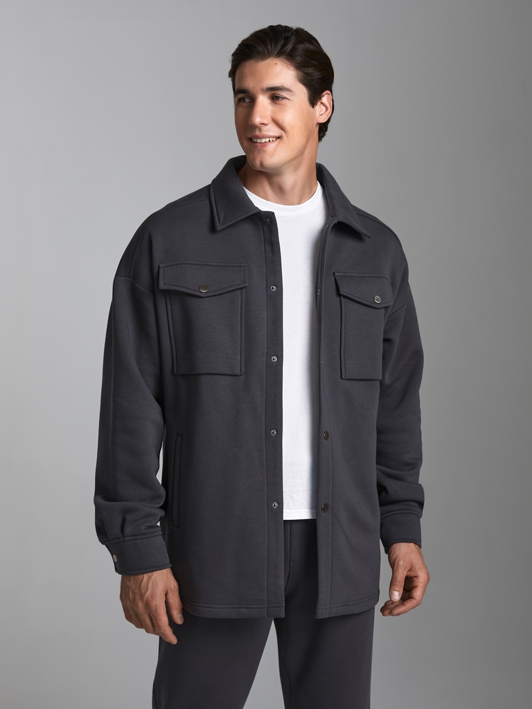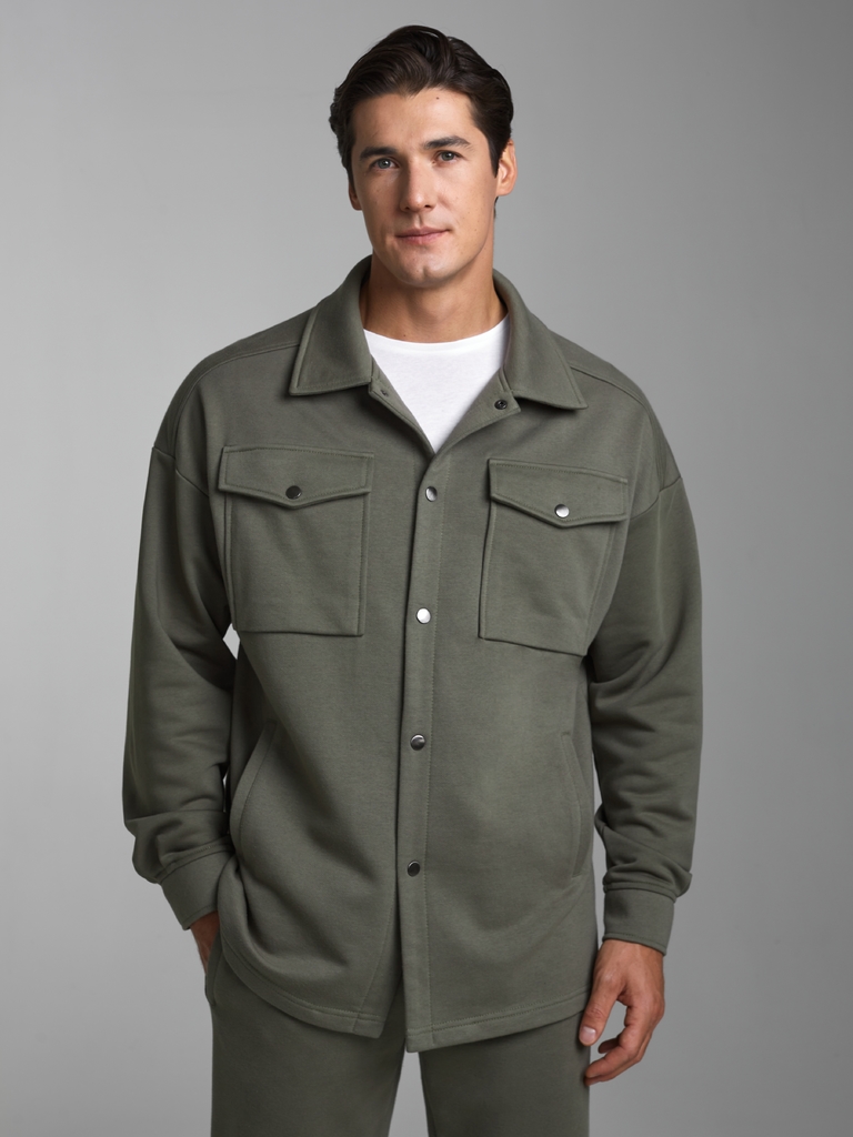 Толстовка- рубашка мужская из плотного и мягкого хлопкового трикотажного полотна с петельной изнанкой. Рукава втачные, свободные, со спущенной линией плеча. Широкие манжеты застегиваются на кнопки. Чи... Показать описаниетать далее Тостовка имеет четыре удобных кармана - два накладных нагрудных кармана с клапанами и два прорезных расположенных ниже, на уровне бедер. Воротник стояче-отложной. Застегивается изделие на металлические кнопки.