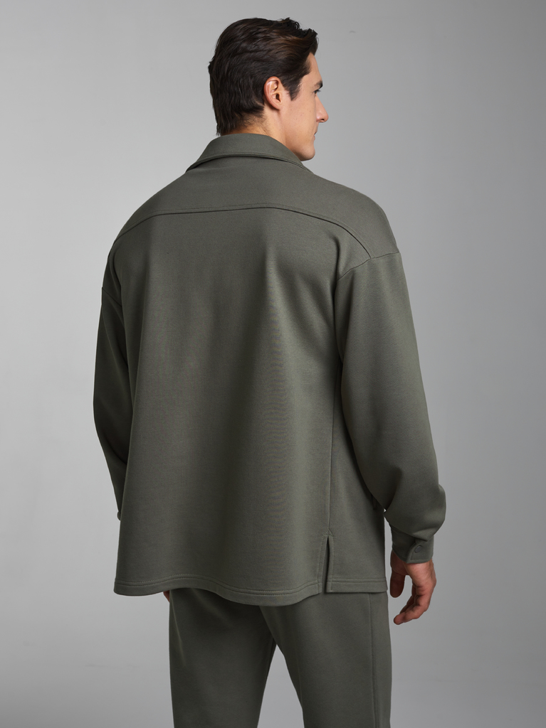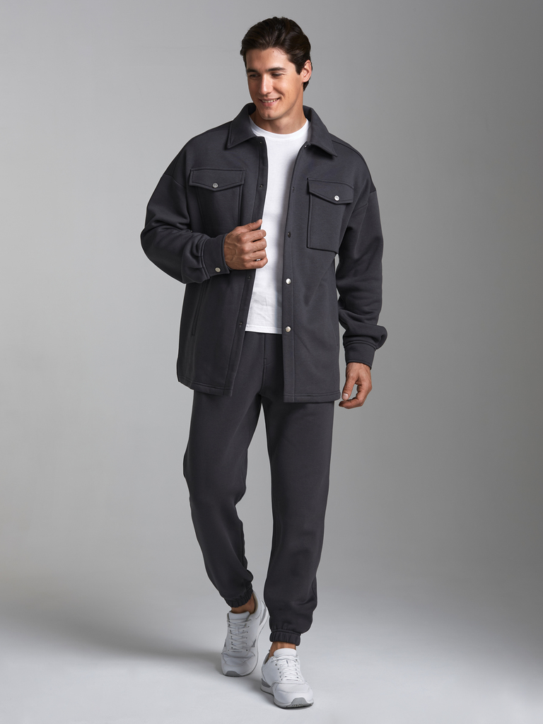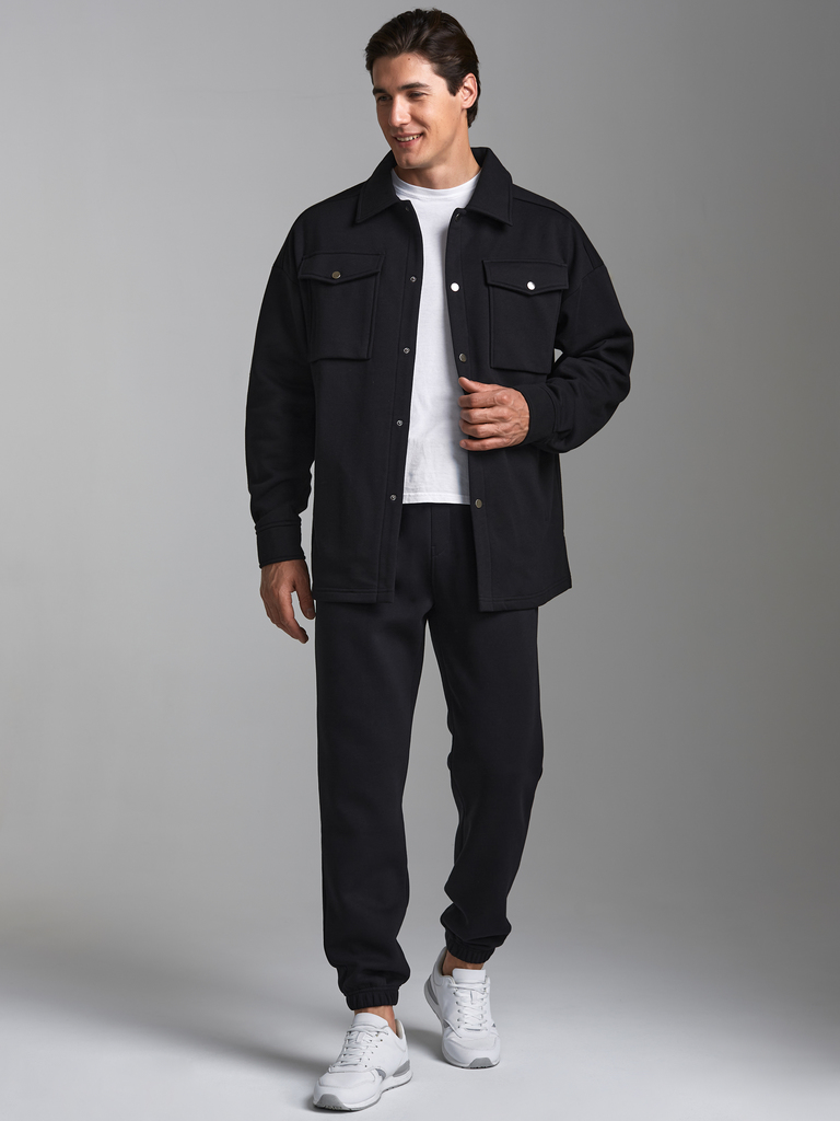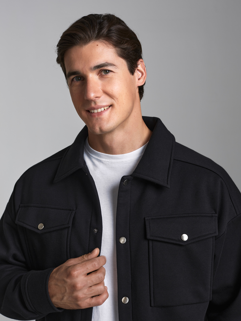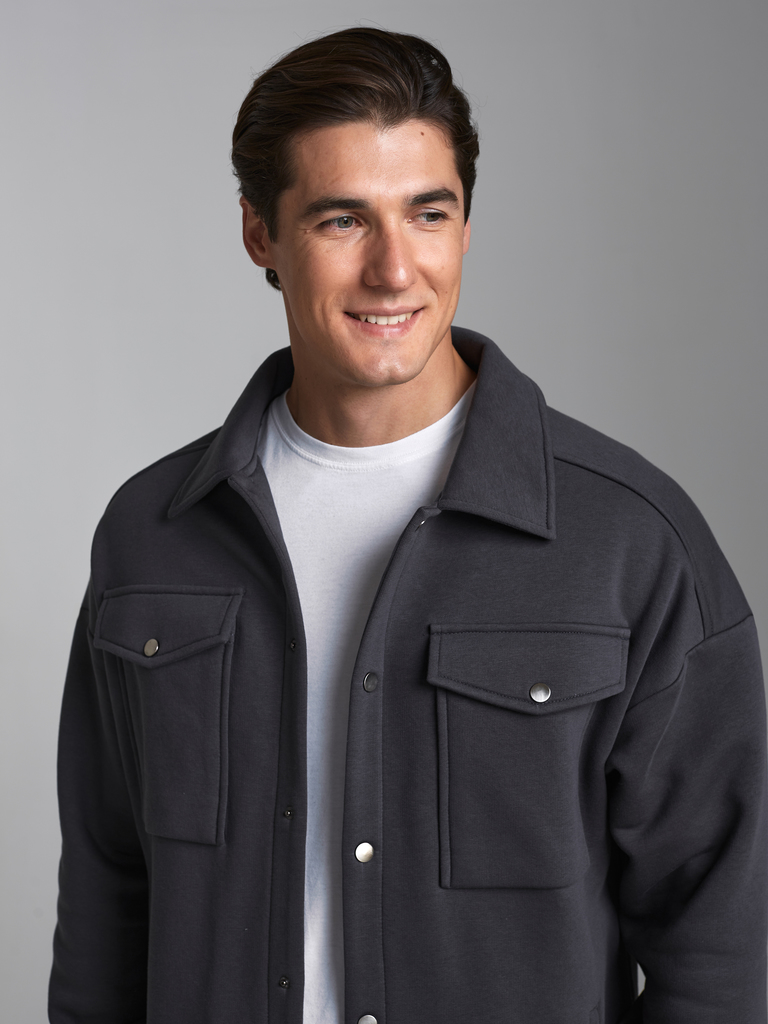 Толстовка- рубашка мужская из плотного и мягкого хлопкового трикотажного полотна с петельной изнанкой. Рукава втачные, свободные, со спущенной линией плеча. Широкие манжеты застегиваются на кнопки. Чи... Показать описаниетать далее Тостовка имеет четыре удобных кармана - два накладных нагрудных кармана с клапанами и два прорезных расположенных ниже, на уровне бедер. Воротник стояче-отложной. Застегивается изделие на металлические кнопки.