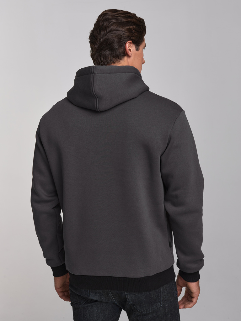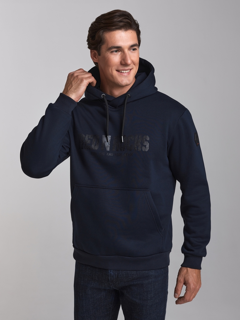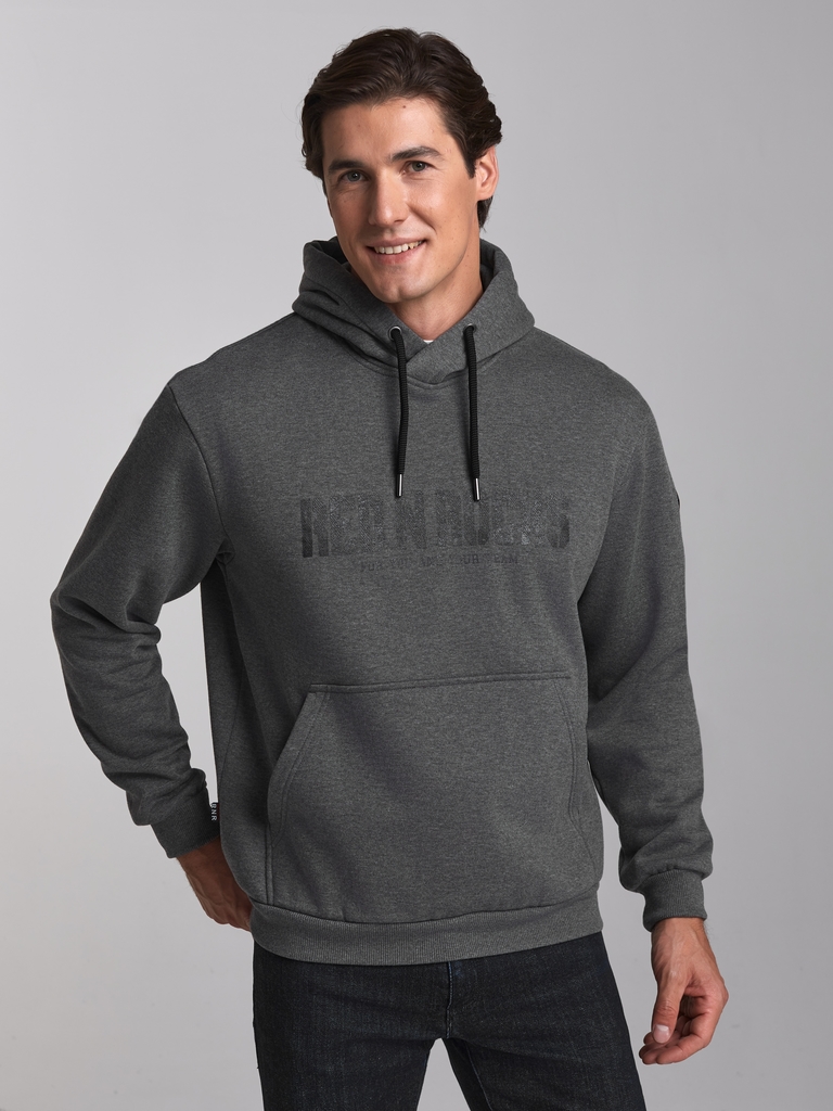 Толстовка мужская из плотного трикотажного полотна, без застежки. Куртка прямого силуэта, с капюшоном, рукав втачной. Карманы типа "кенгуру". Читать далее По краю капюшона проходит широкий плетеный шн... Показать описаниеур. Логотип вышит на полочке.