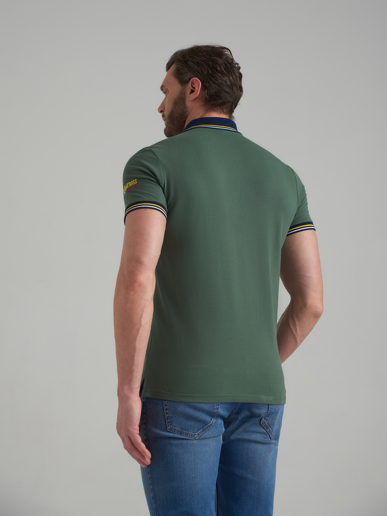 Футболка-поло из хлопкового полотна "пике". Классическая модель поло с короткими рукавами. Воротник и манжеты рукава выполнены из трикотажной рибаны темно-синего цвета с бело-желтой полосой. Читать да... Показать описаниелее На полочке застежка-планка на пуговицах. На нижней планке и по горловине настрочена контрастная киперная тесьма. На полочке выполнена вышивка "INTERNATIONAL TEAM" и вышивка флагов. По низу футболки в боковых швах выполнены разрезы, обработанные тесьмой. С правой стороны полочки, по низу настрочен жаккардовый "флажок" с логотипом.