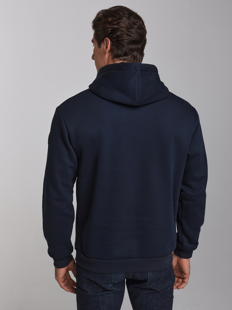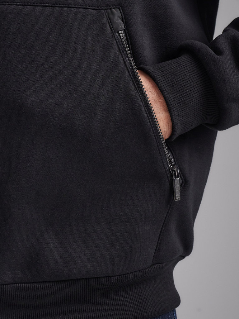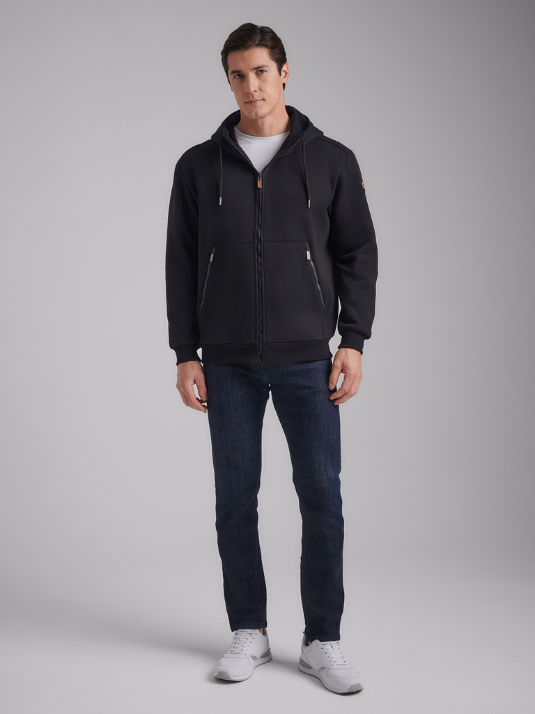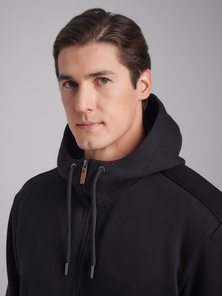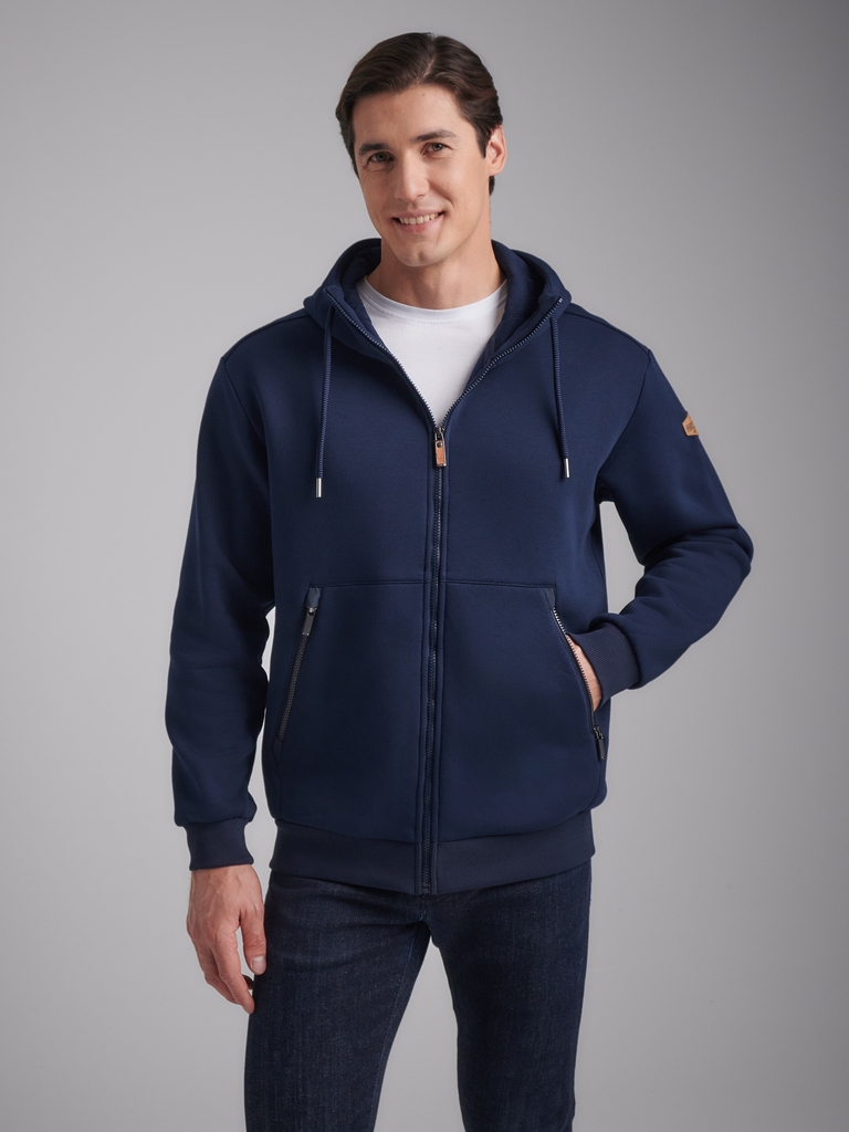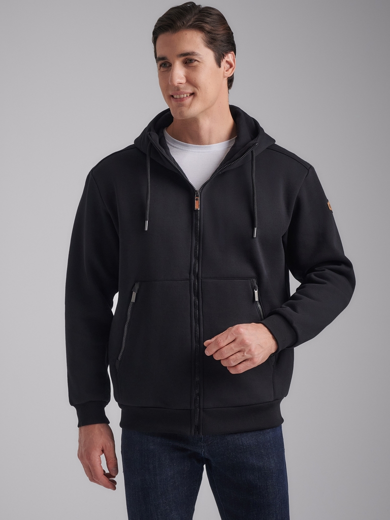 Толстовка мужская из плотного и мягкого хлопкового трикотажного полотна с изнаночным начесом. Капюшоном с подкладкой из кулирного полотна. Манжеты по рукавам и пояс толстовки из рибаны. Читать далее Н... Показать описаниеа полочке и спинке отрезные кокетки. Карманы выполнены в отрезных деталях полочки с листочками без молний. На обоих полочках выполнены прорезные вертикальные нагрудные карманы с открытыми молниями. На полочках, с внутренней стороны, подкладка из кулирного полотна.