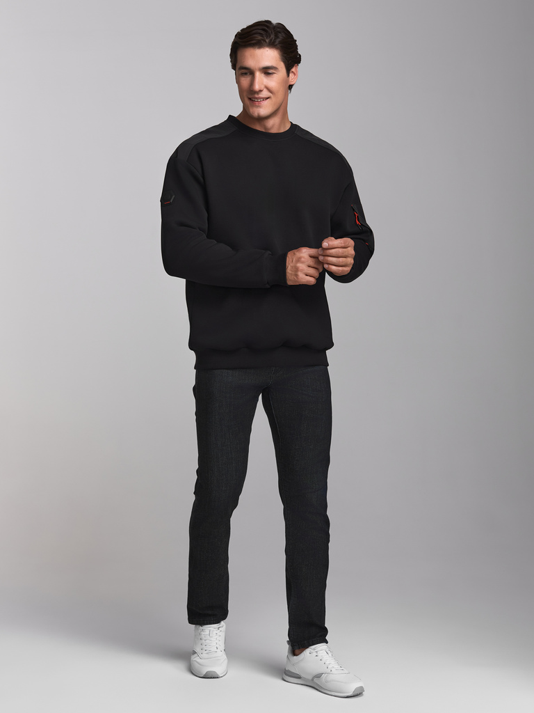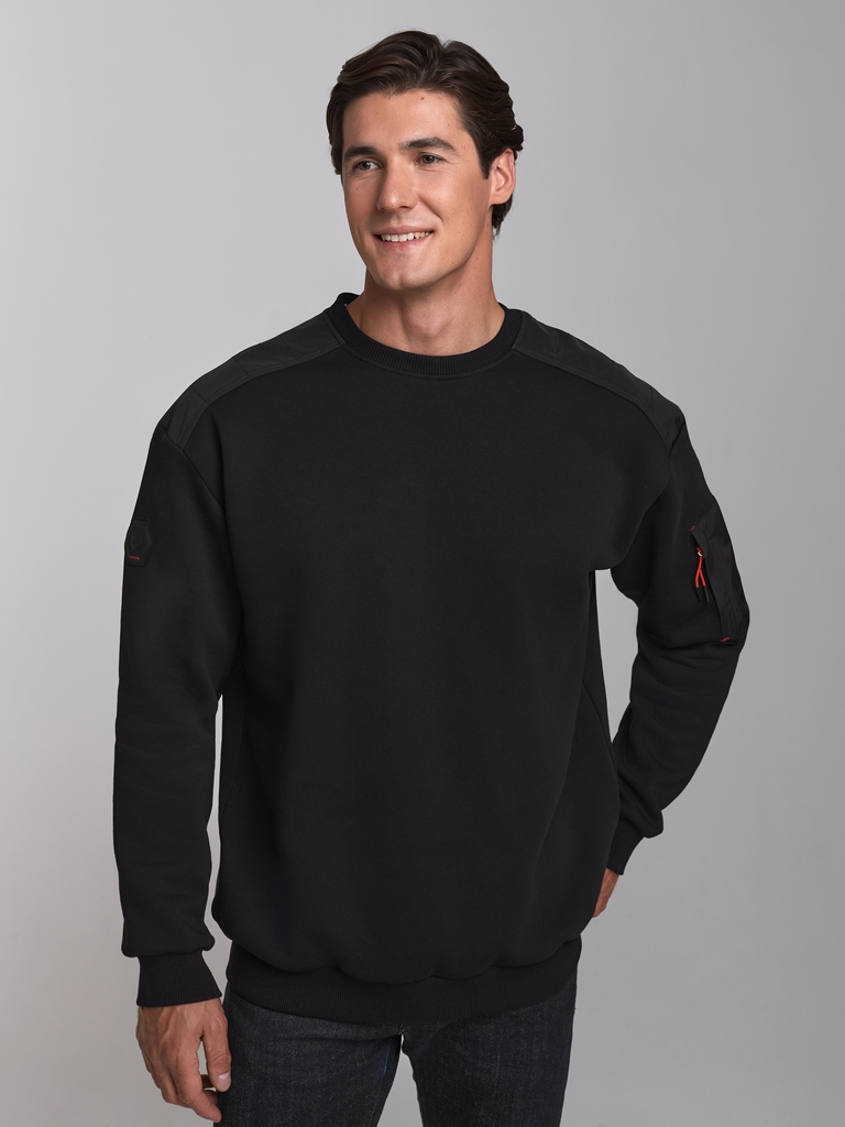 Свитшот изготовлен из плотного хлопкового трикотажного полотна с изнаночным начесом. Изделие на поясе, стеганные кокетки продублированы плащевой тканью. Из нее так же изготовлен накладной карман левог... Показать описаниео рукава. Читать далее Карман застёгивается на молнию. Пояс, бейка горловины и манжеты куртки изготовлены из плотной эластичной трикотажной резинки. На верхней части правого рукава - шеврон с фирменным логотипом.