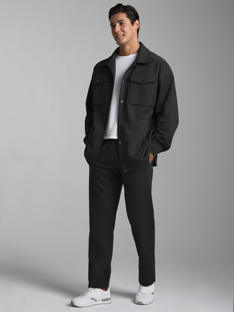 Брюки мужские из плотного хлопкового трикотажного полотна с петельной изнанкой. Брюки прямого силуэта с прорезными карманами, Эластичный пояс дополнительно регулируется шнуром.
