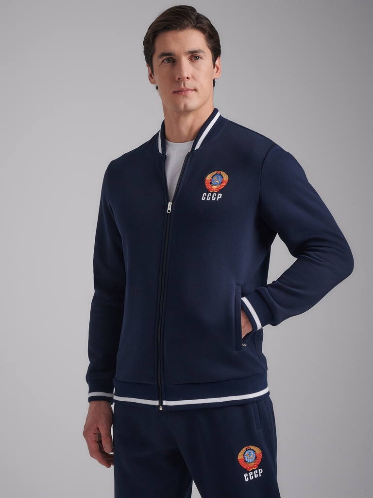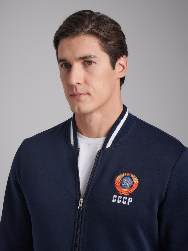 Мужская толстовка-бомбер из плотного хлопкового трикотажа с изнаночным начесом. Толстовка свободного покроя, на поясе, застегивается на молнию. Рукава втачные . Читать далее Прорезнные карманы с молни... Показать описаниеями. Слева на груди вышивка герба СССР. На спинке белая вышивка-аппликация СССР. Пояс куртки, манжеты и воротник выполнены из подвяза с белой полосой.