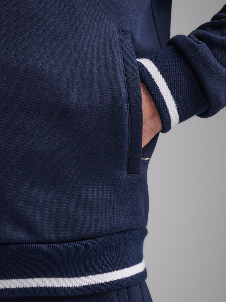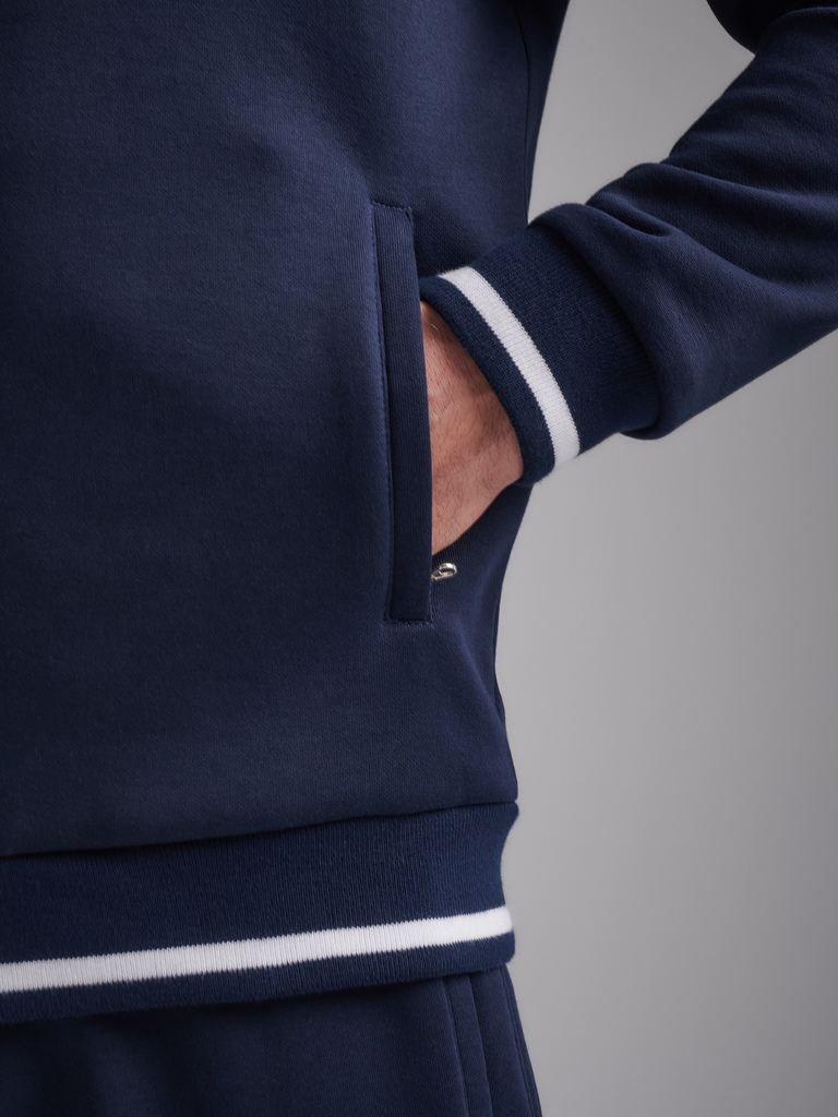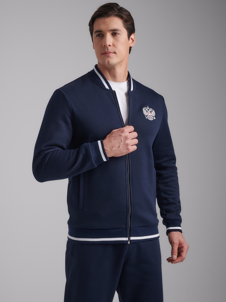Мужская толстовка-бомбер из плотного хлопкового трикотажа с изнаночным начесом. Толстовка свободного покроя, на поясе, застегивается на молнию. Рукава втачные . Читать далее Прорезные карманы с молния... Показать описаниеми. Слева на груди вышивка герба России. Пояс куртки, манжеты и воротник выполнены из подвяза с белой полосой.
