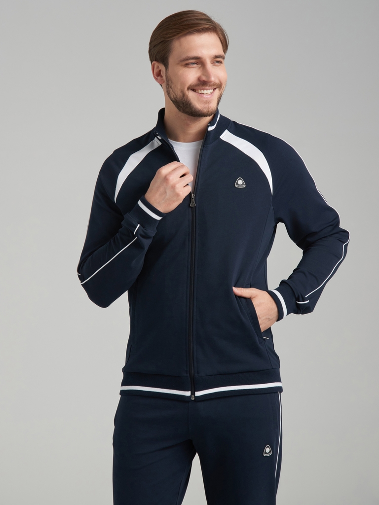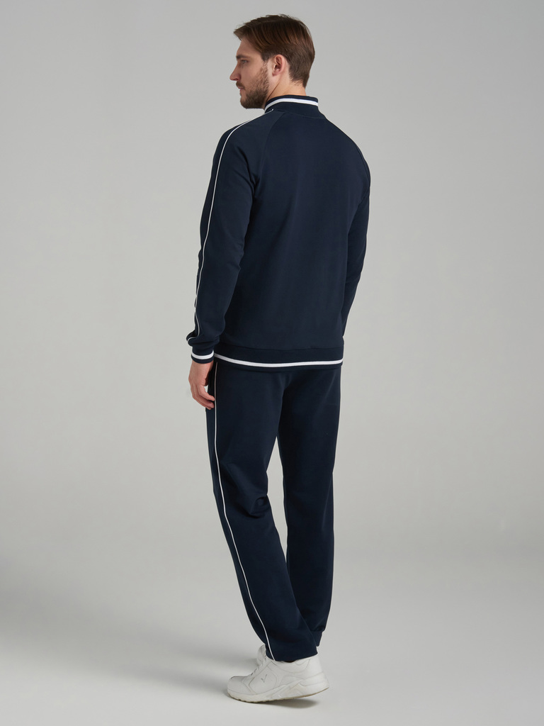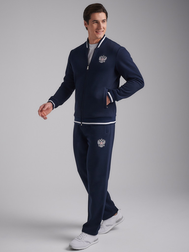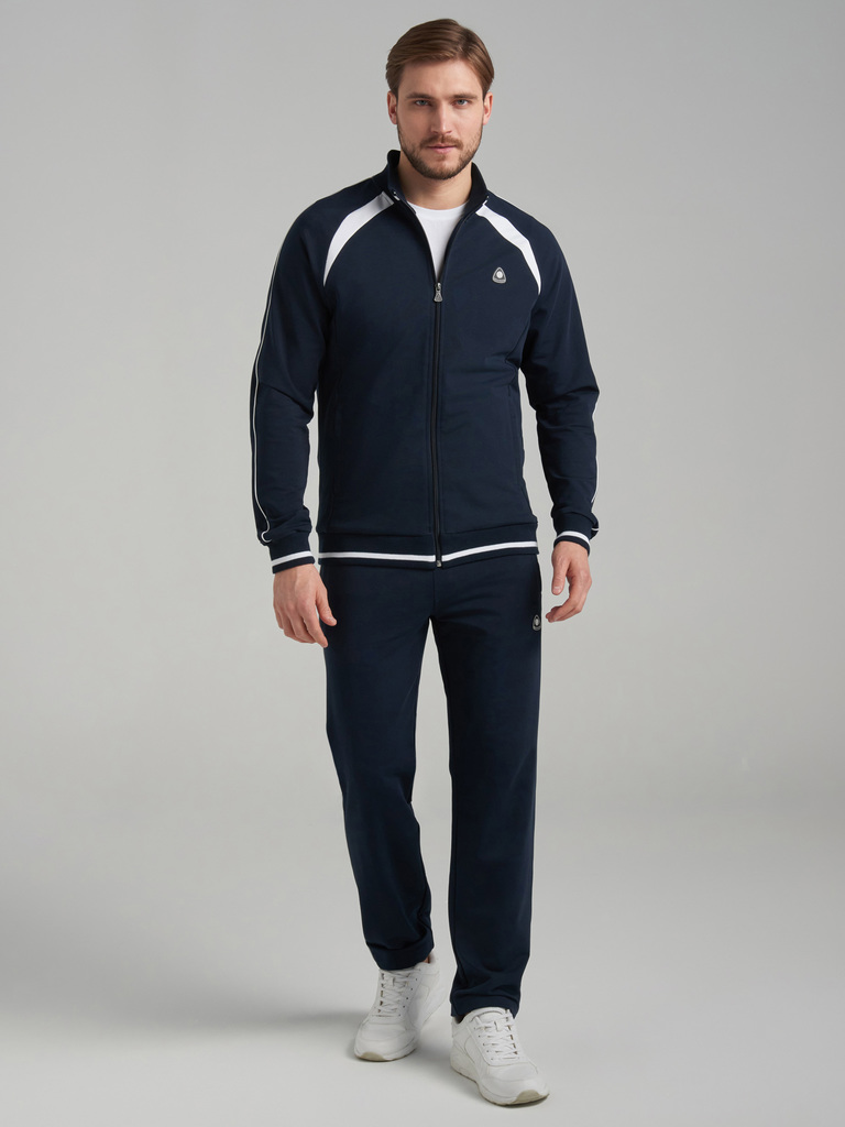 Спортивный костюм из хлопкового трикотажного полотна. Куртка костюма на поясе, с воротником-стойкой, застегивается на молнию. Рукава покроя реглан. Читать далее По плечевому шву рукавов и боковым швам... Показать описание брюк проложен кант белого цвета. Стилистика костюма поддерживается белой вставкой по плечам. карманы куртки и брюк прорезные с планками, застегиваются на молнии. Пояс, воротник и манжеты куртки изготовлены из эластичного подвяза с узкой белой полосой . Брюки прямые, зауженные книзу. Пояс брюк по линии талии с эластичной резинкой так же дополнительно регулируется шнуром. Слева на груди и под левым карманом брюк нашиты шевроны с фирменным логотипом...