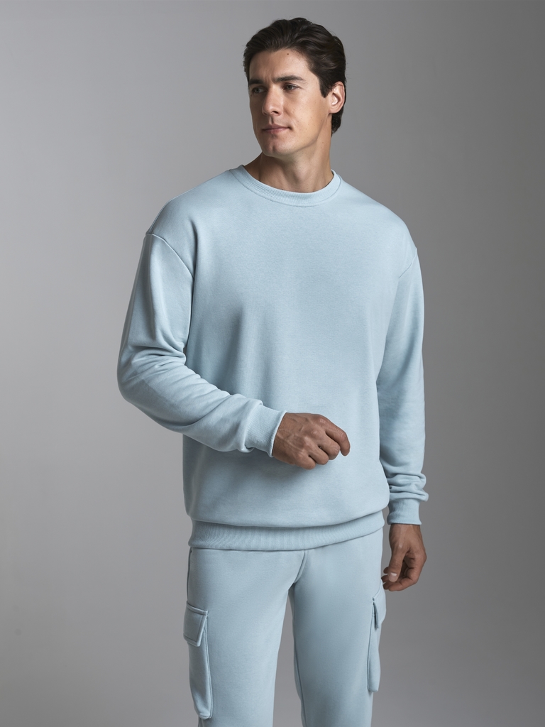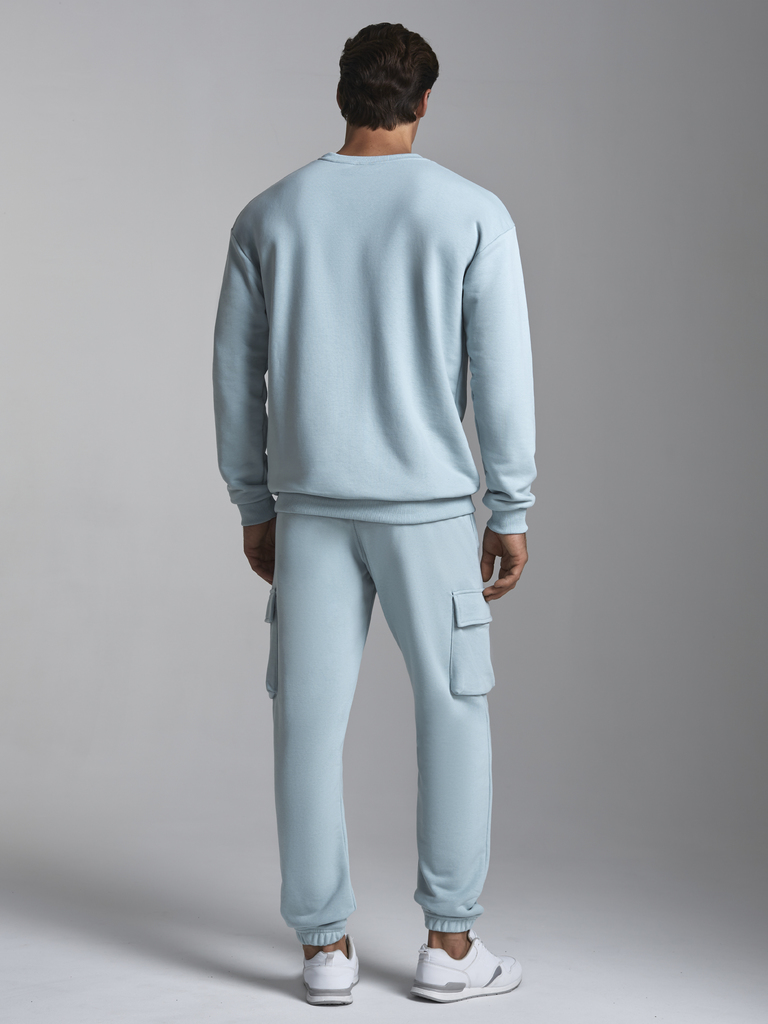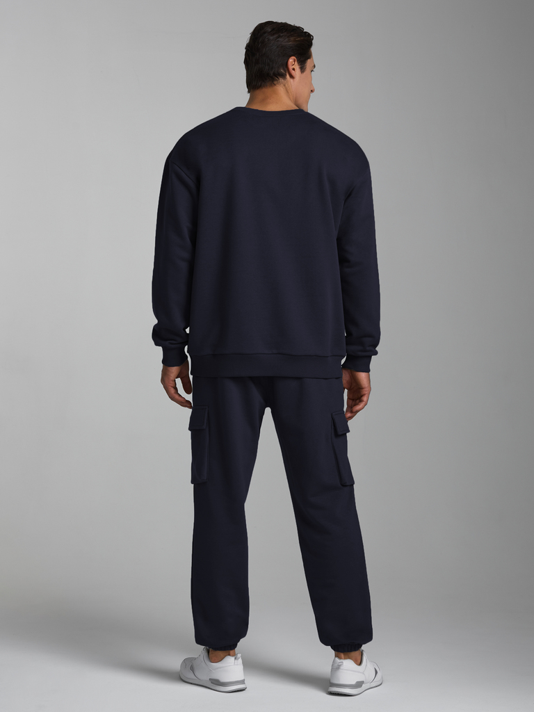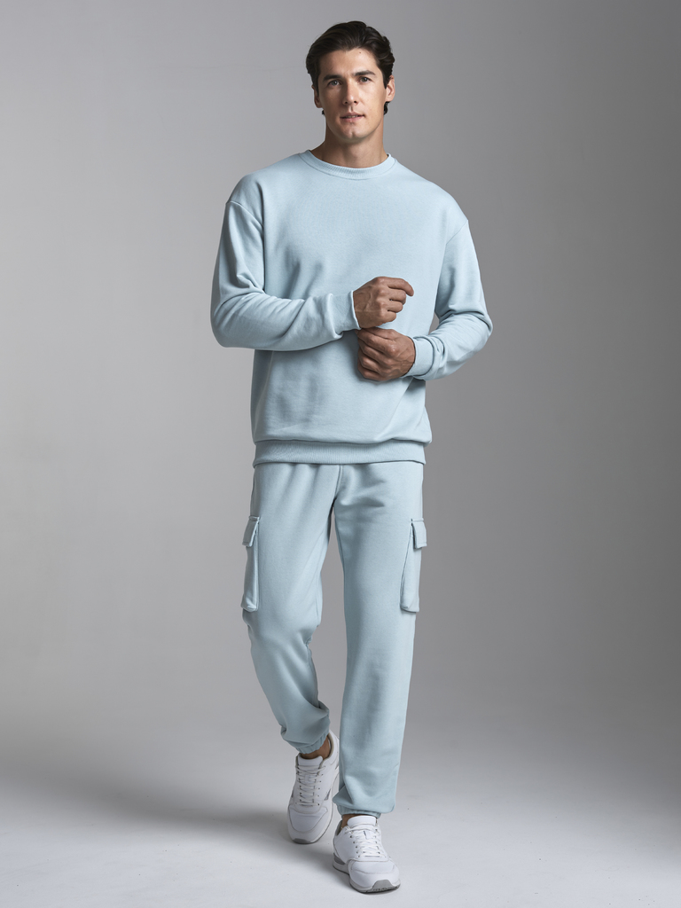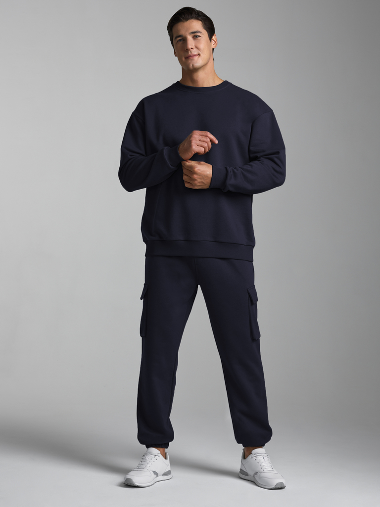 Мужской спортивный костюм , из плотного трикотажа с петельной изнанкой. Верх комплекта - свитшот ( джемпер) свободного силуэта. Рукава втачные, широкие со спущенной линией плеча. Читать далее Джемпер ... Показать описаниебез застежки. По вороту, низу рукавов и низу джемпера пришита рельефная трикотажная резинка. На брюках "Карго" два объемных накладных кармана с клапанамии и еще два кармана в боковых подрезах. Брюки зауженны книзу на манжет. Пояс брюк по линии талии с эластичной резинкой, дополнительно регулируется шнуром.