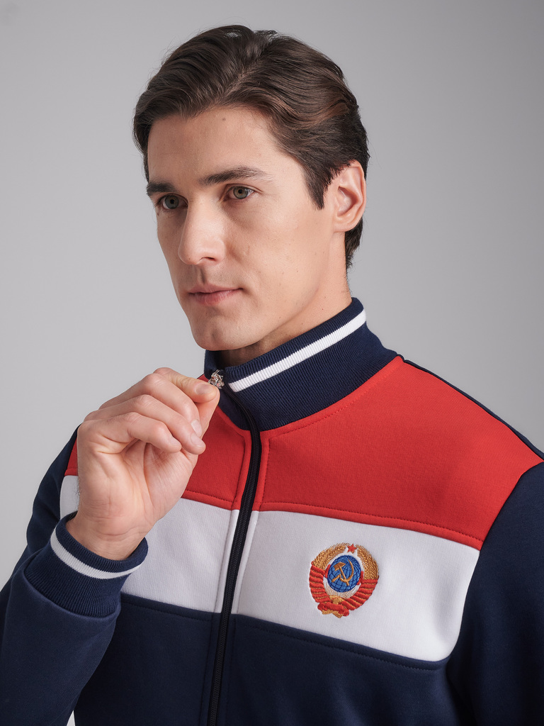 Мужская толстовка из плотного хлопкового трикотажа с изнаночным начесом. Толстовка свободного покроя, на поясе, застегивается на молнию. Рукава втачные. Читать далее Прорезные карманы с молниями. Коке... Показать описаниетка куртки и поперечная нагрудная вставка выполнены из красного и белого полотна, на белой вставке слева - вышивка герб СССР. На спинке белая вышивка-аппликация СССР. Пояс куртки, манжеты и воротник выполнены из подвяза с белой полосой.