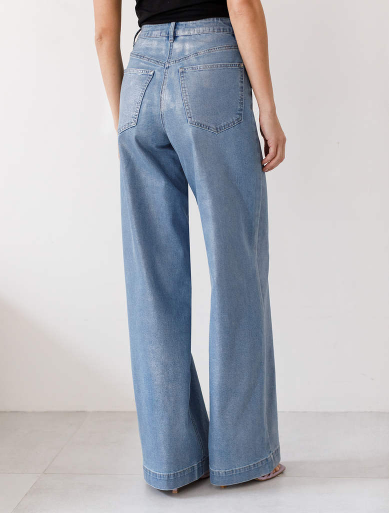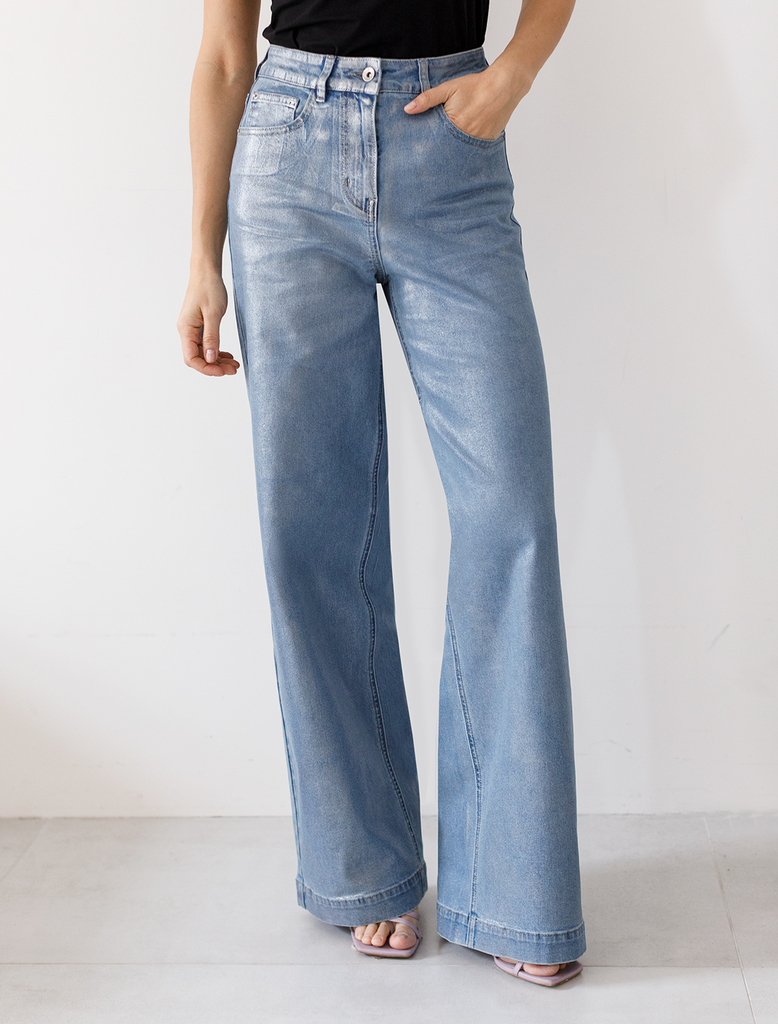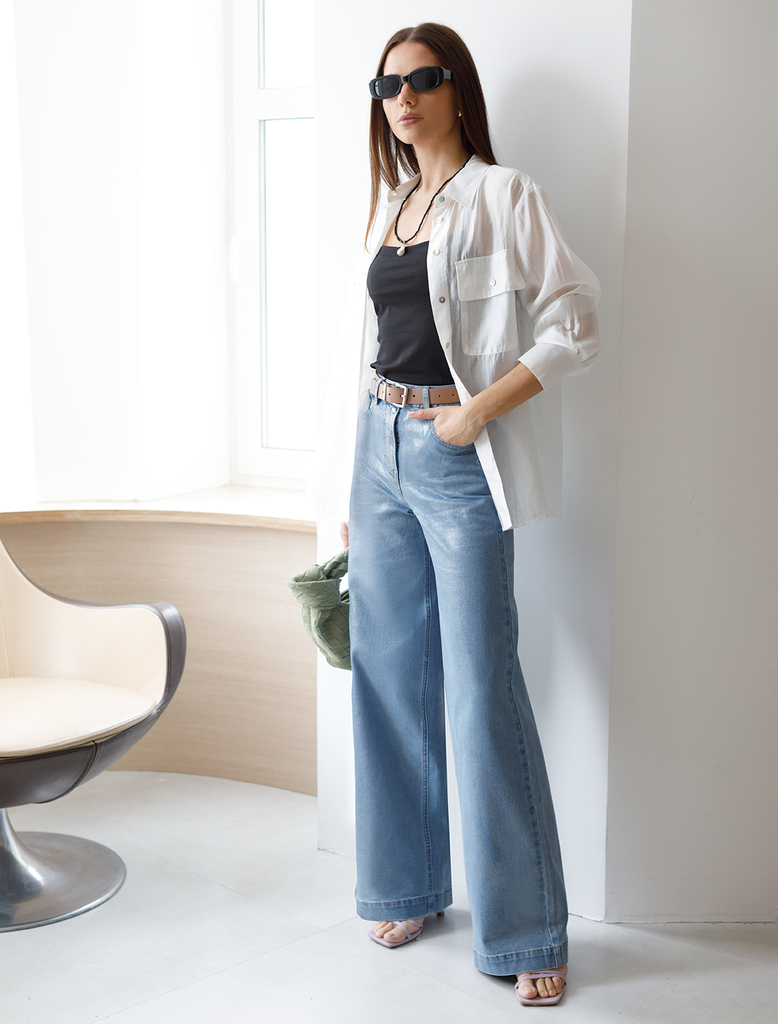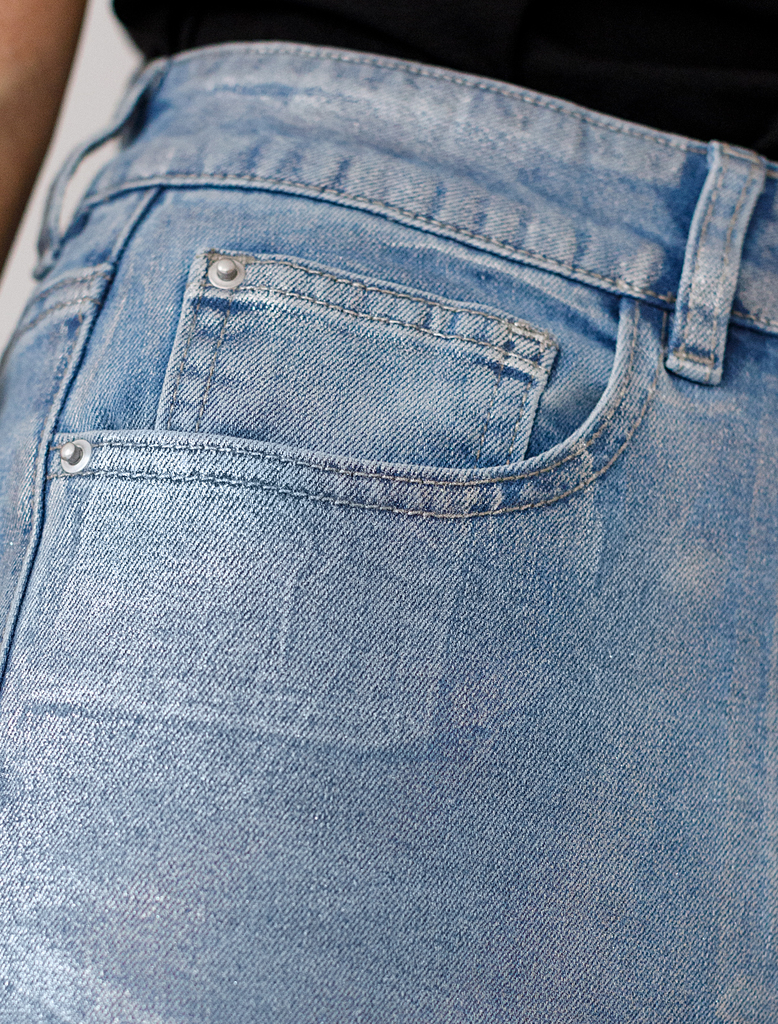 Состав: 70%Хлопок 28%ПЭ 2%ПУ Плотность: 11 OZ Параметры модели на первом фото: Рост 172, бюст 88, талия 64, бедра 88 Размер товара на первом фото: 42 Джинсы-трубы выполнены из эластичного денима. Свер... Показать описаниеху изделия нанесено стойкое, но при этом мягкое металлизированное покрытие с декоративными потёртостями. Неравномерность серебряного покрытия придает особый шарм каждому изделию. За счет высокой посадки на талии и свободного силуэта, модель вытягивает силуэт, визуально стройнит и подходит для любой фигуры. Хорошо подойдут для праздничного выхода и внесут яркую изюминку в повседневный образ.