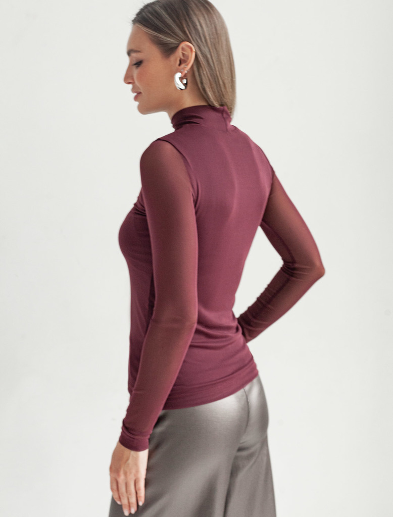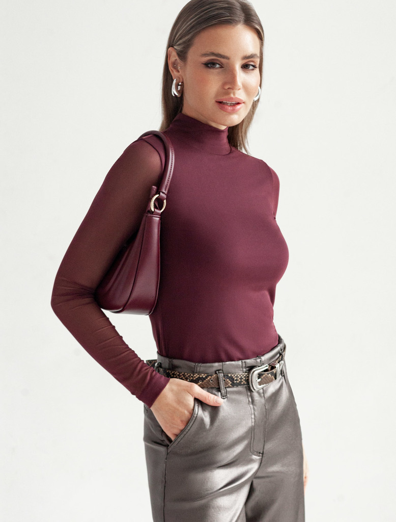 Состав: 95%ПЭ 5%ПУ; ПОДКЛАДКА- 95%Вис 5%ПУ Плотность: 90 Г/м2 Элегантная модель из мягкой вискозы с эффектными деталями! Основная часть водолазки бордового цвета выполнена из плотного вискозного трико... Показать описаниетажа, обеспечивающего комфорт, в то время как рукава из тонкой сетки создают стильный контраст. Двойной воротник с отворотом добавляет образу многослойность и универсальность. Модель отличается безупречной посадкой по фигуре!