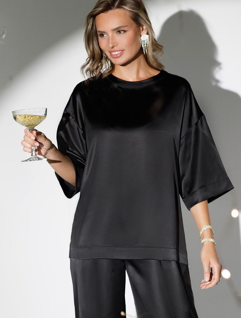 Состав: 97%ПЭ 3%ПУ Плотность: 190 Г/м2 Блузка с короткими рукавами черного цвета из струящегося плотного сатина создана для ценительниц комфорта и элегантности. Материал отличается высокой плотностью,... Показать описание что делает блузку устойчивой к износу и сохраняет аккуратный внешний вид даже при длительном использовании. Струящаяся ткань элегантно ложится по фигуре, подчеркивая достоинства силуэта без лишней утяжеленности, в тоже время приятно ощущается на теле. Свободный крой блузки и спущенная линия плеча дарят ощущение легкости и непринужденности, делая образ одновременно женственным и современным. Широкие рукава средней длины гармонично дополняют образ и идеально подходят для полных рук, обеспечивая комфорт, свободу движений и уверенность. Аккуратная застежка на маленькую пуговицу добавляет утонченности, а круглый вырез красиво обрамляет шею, создавая аккуратную линию декольте. Блузка смотрится нарядно благодаря сочетанию мягкой текстуры сатина и его мягкого не вычурного блеска. Такая повседневная блузка легко впишется в деловой гардероб или станет отличным выбором для вечерней встречи с друзьями. Она гармонично сочетается с юбками, брюками или джинсами — вы сможете создать множество вариантов нарядов на каждый день или подобрать подходящий лук для особого случая, праздника или Нового года.